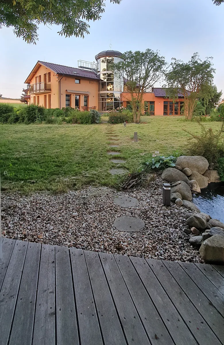 parapety žulové, dveře mahagonové, venkovní terasy z trvanlivého tvrdého dřeva bangkirai, krbová kamna, krb.