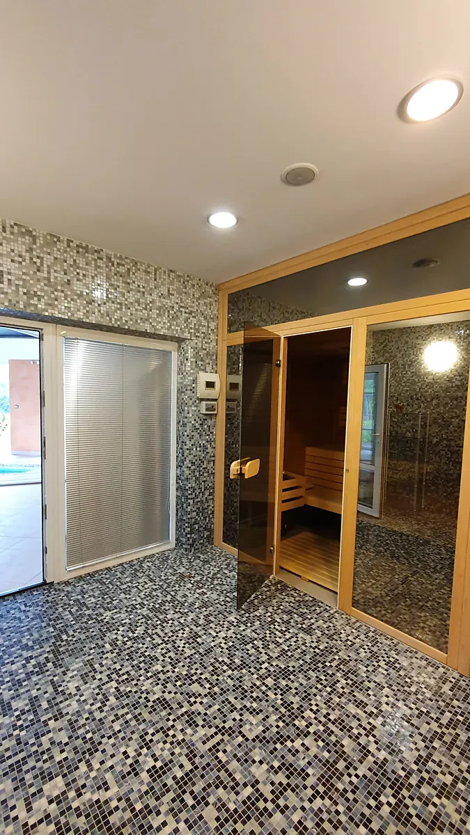 sauna, odpočinková místnost, WC pro saunu a bazén, úklidová místnost, sklad sportovních potřeb, WC, zimní zahradka.