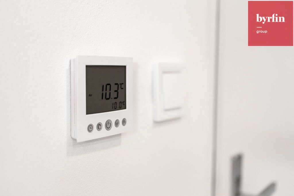 Byt má elektrické podlahové vytápění s termostaty v každé místnosti. Ohřev vody je zajištěn elektrickým bojlerem.
