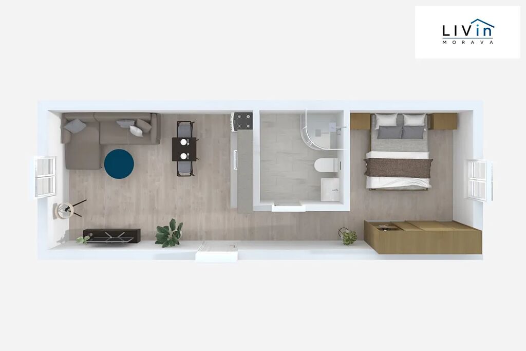 Byt dispozičně obsahuje dvě obytné místnosti, kuchyň a koupelnu spojenou s WC.