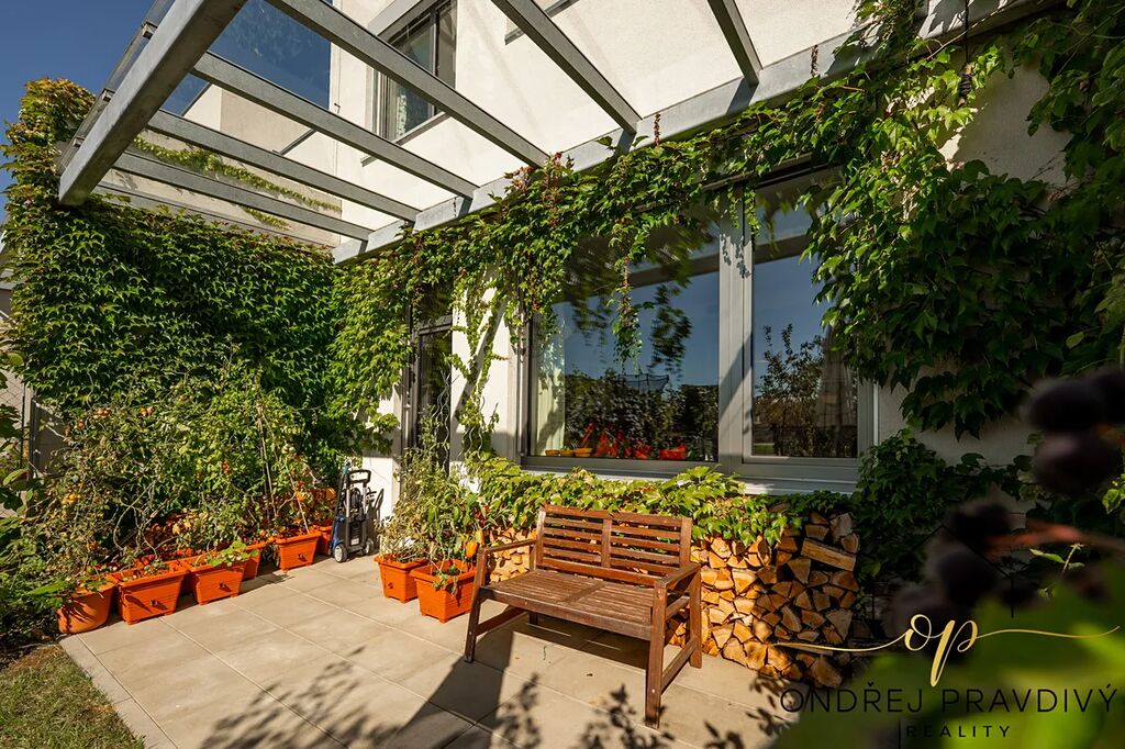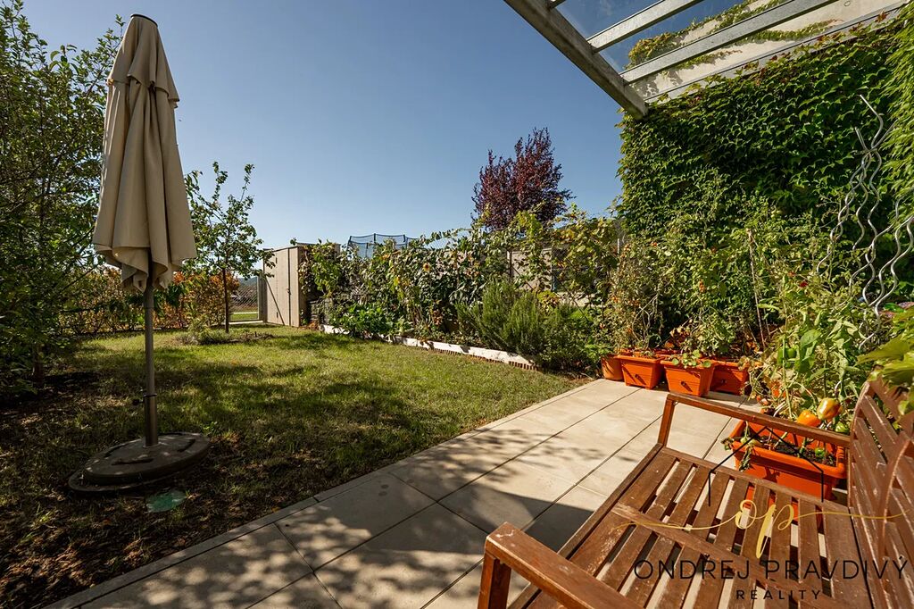 Krytá terasa s navazující ovocnou zahradou je ideální pro rodiny s dětmi, kde se vejde vše tak akorát vč. stávajícího zahradního domku. Ze zahrady je přímý přístup na sousední nový park s dětským hřištěm, workoutovým hřištěm a inline dráhou.. Před domem jsou na vlastním pozemku dvě zpevněná parkovací stání.