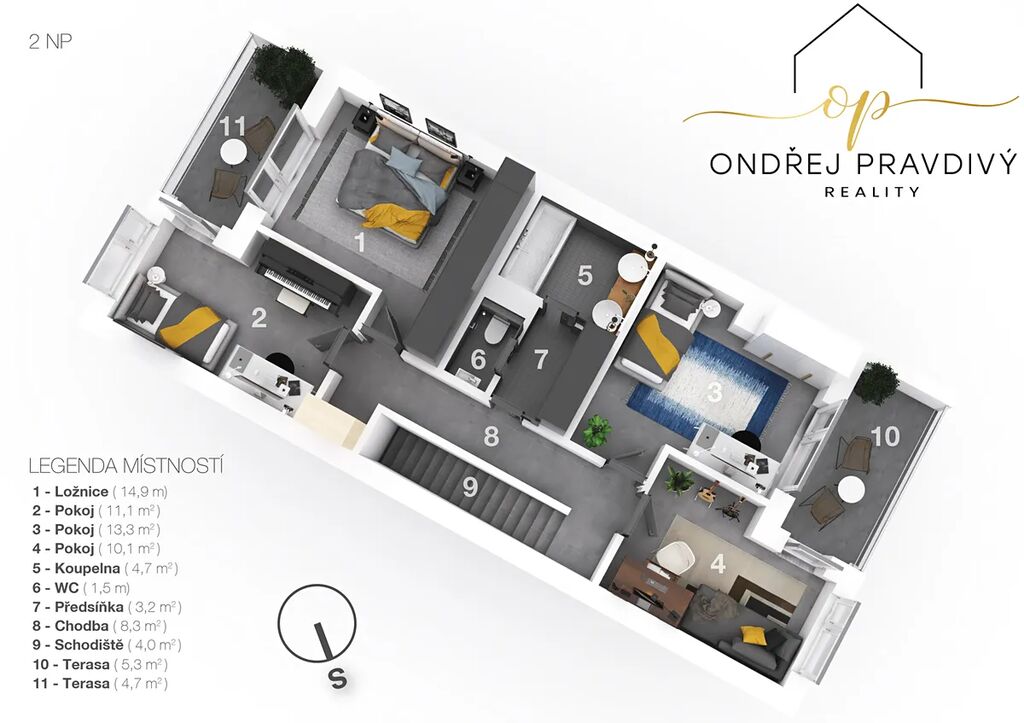 Dispozice zahrnuje příjemně světlý obývací pokoj s jiho-západní orientací a interiérovým krbem, který dotváří jeho útulnou atmosféru. V přízemí pak kromě prostorného kuchyňského koutu najdete praktickou spíž, pokoj, technickou místnost s prádelnou, předsíň s vestavěnou skříní, toaletu a sprchu. V patře se nachází další 4 ložnice, centrální chodba se schodištěm, koupelna s vanou a samostatnou toaletou. Ze všech ložnic je vstup na dva balkóny, které poskytují prostor pro odpočinek i působivý výhled.