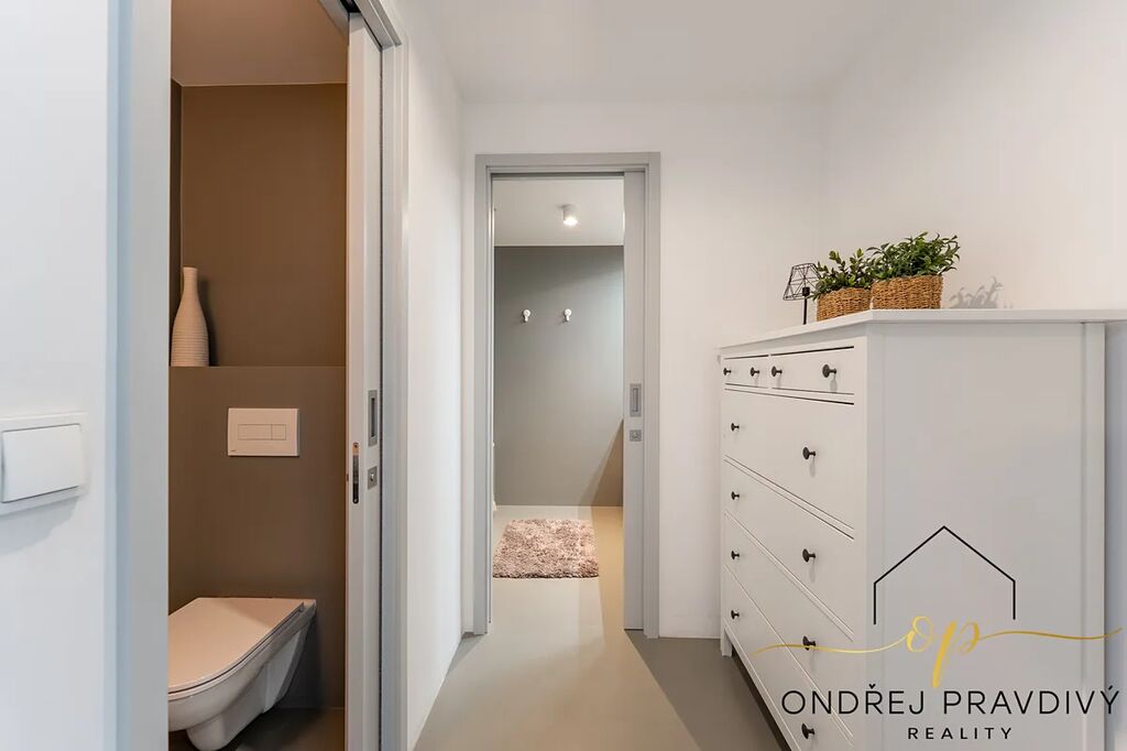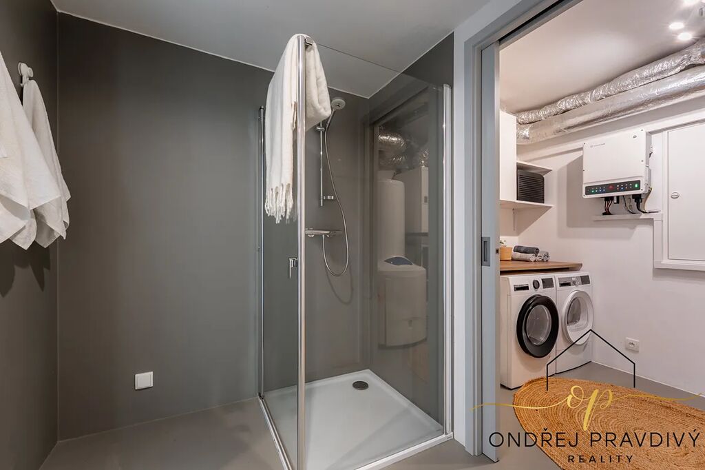 Celý interiér domu je s interiérovými dveřmi a značkovými okny (3sklo) laděn do nadčasových šedých tónů a působí vzdušně. K tomu přispívá i nadstandardní světlá výška obývacího pokoje 3,0 m. Bonusem jsou pak omyvatelné výmalby v celém domě, venkovní žaluzie na všech oknech a podzemní jímka na dešťovou vodu.