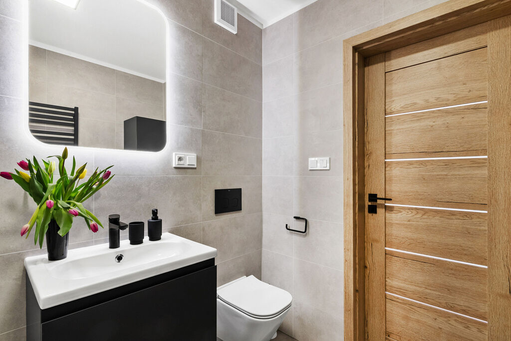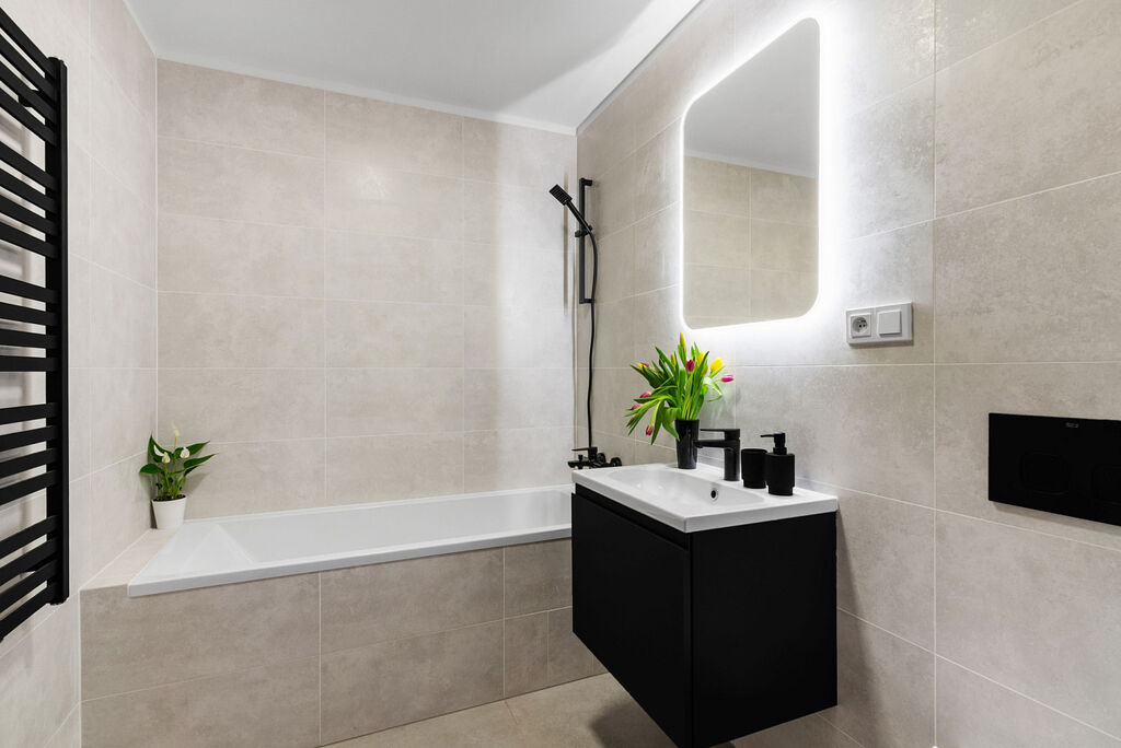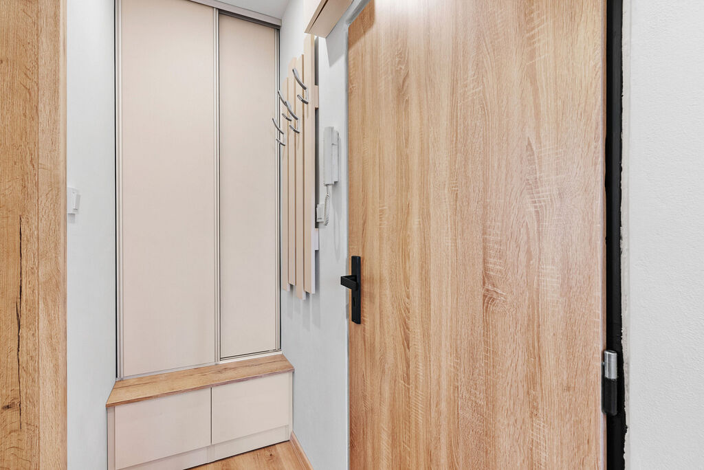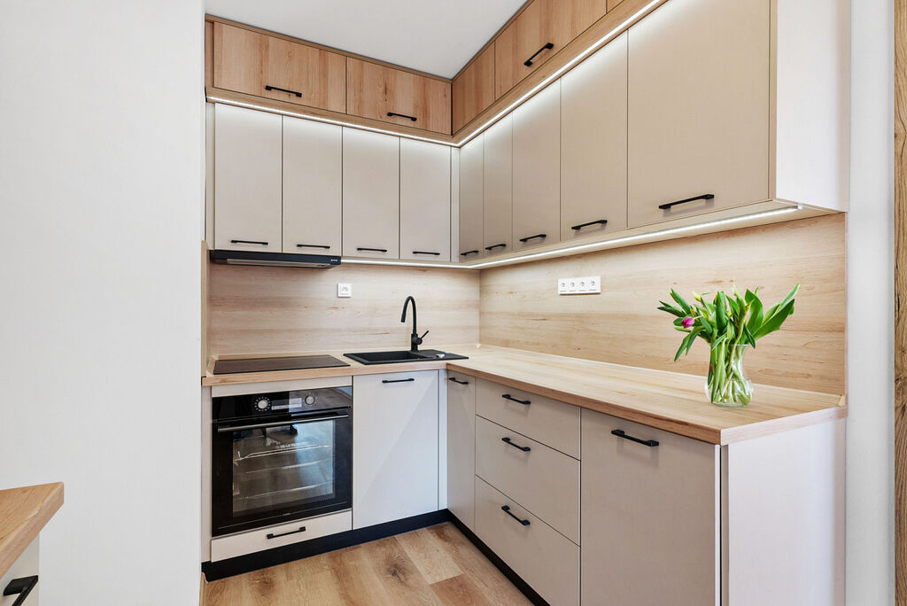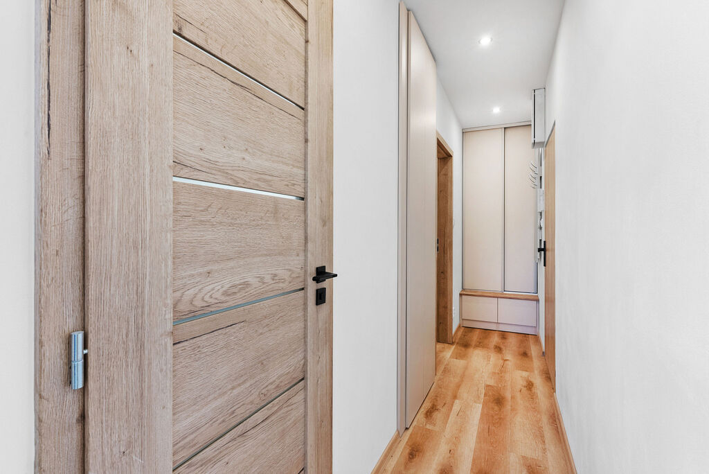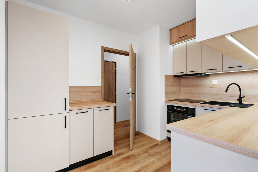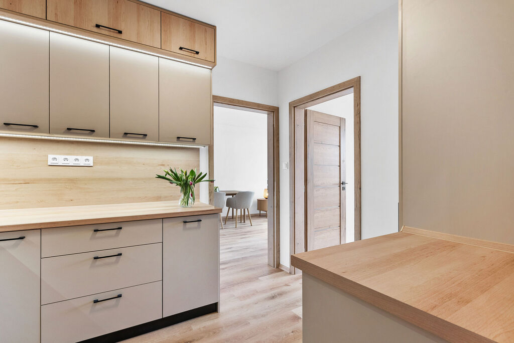 Kvalitní rekonstrukce probíhala s důrazem na funkčnost a estetiku. Kuchyňská linka byla vyrobena na míru a vybavena špičkovými spotřebiči - tichou myčkou, indukční varnou deskou, troubou a vestavěnou lednicí. Moderní design bytu je sladěný do harmonických tónů, což vytváří příjemnou atmosféru a pocit domova hned po nastěhování.