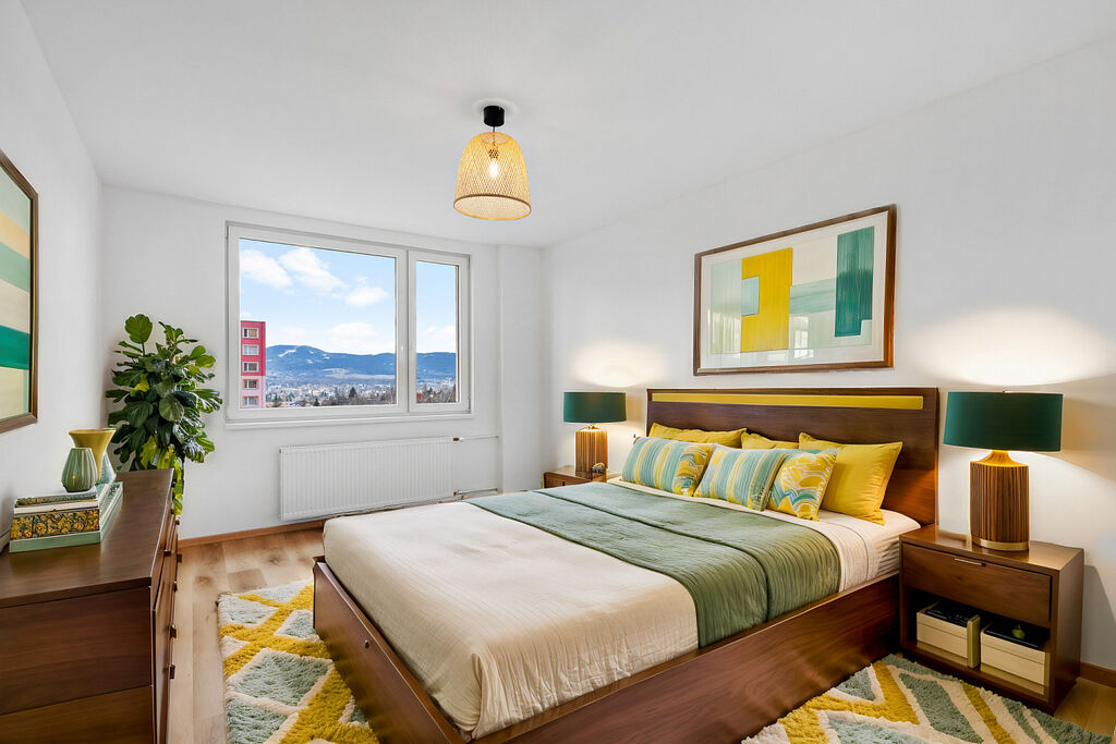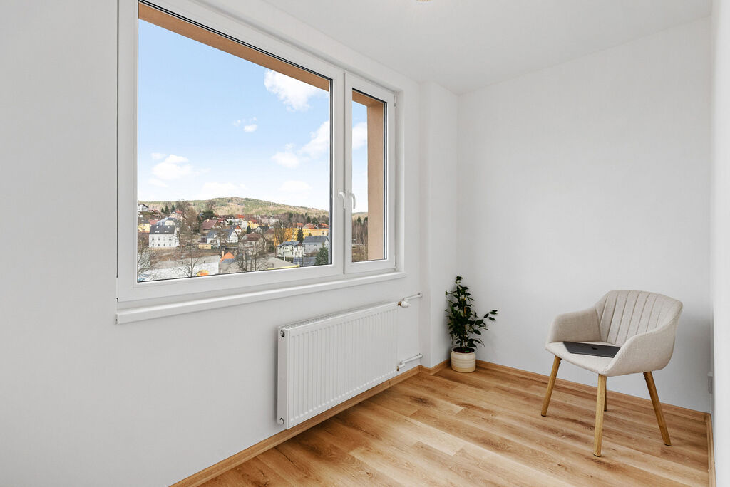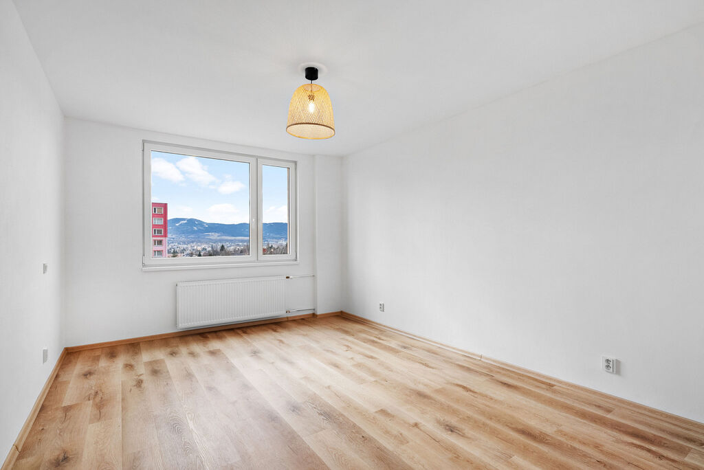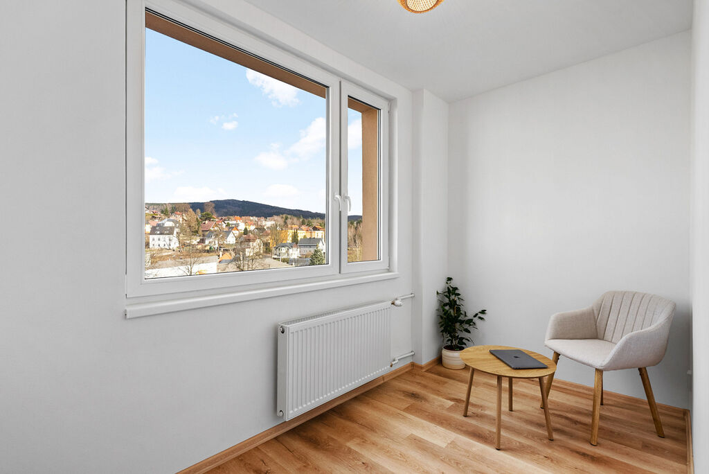 Díky chytré rekonstrukci byl původní byt 2+1 přebudován na prostorný 3+1 o rozloze 60 m², čímž získáte samostatný pokoj, ideální jako pracovnu nebo malý dětský pokoj, a navíc s krásným výhledem.
