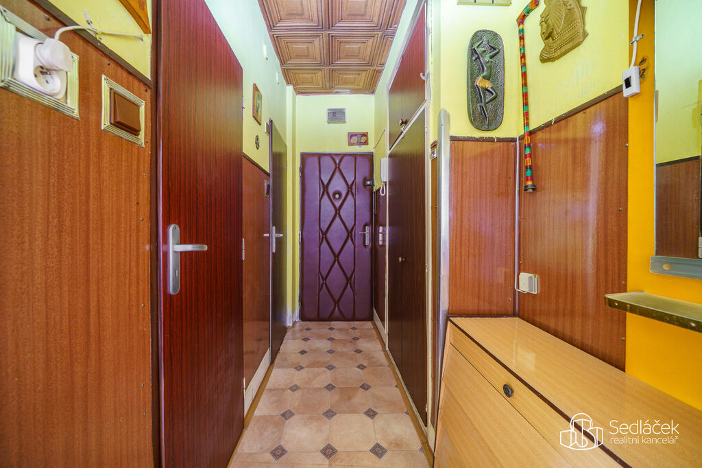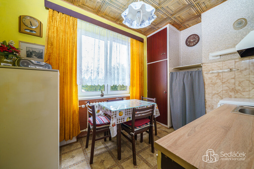 Dispozice: předsíň s vestavěnými skříněmi, samostatné WC, koupelna s vanou, kuchyň s plynovým sporákem a zachovalou linkou, obývací pokoj s balkonem a výhledem do dvou světových stran a ložnice. Jádro je zděné, okna plastová.
