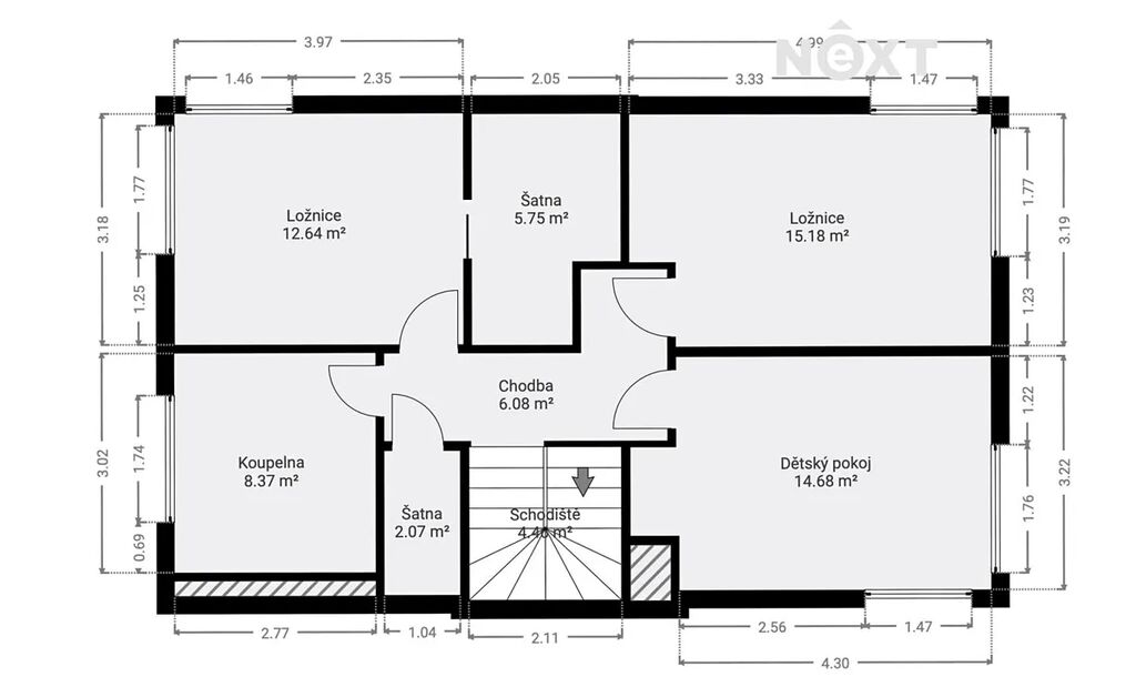 V patře vás čekají tři ložnice, dvě šatny a prostorná koupelna. Podlahy kombinují dlažbu a plovoucí podlahu – praktické a útulné zároveň.