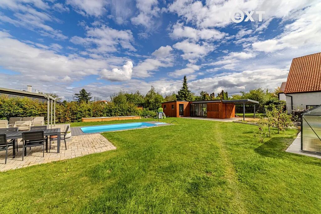 Na celkových 1080 m² si užijete dost místa pro relax i zábavu. Zahrada je travnatá, s několika ovocnými stromy a okrasnými keři. Nechybí ani zvýšený truhlík pro zeleninu, skleník a 20 m² bazén, který oceníte hlavně v létě. A pokud přijedou hosté? Ti se pohodlně ubytují v zahradním domku s vlastní obytnou jednotkou.