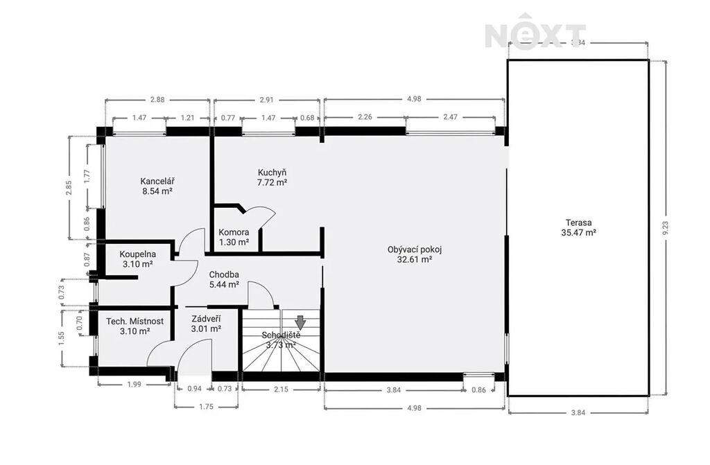 V přízemí najdete to pravé centrum rodinného života – velký obývák s kuchyňským koutem, spíží a přímým vstupem na 35 m² terasu. V zimě se můžete zachumlat do deky a užít si praskající oheň v krbových kamnech. Dále je tu pracovna, koupelna, technická místnost, chodba a zádveří.