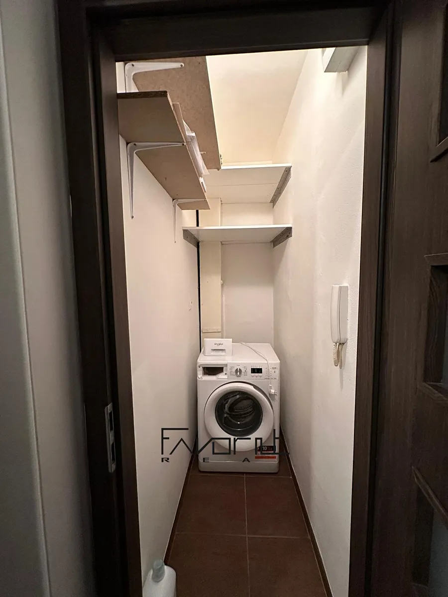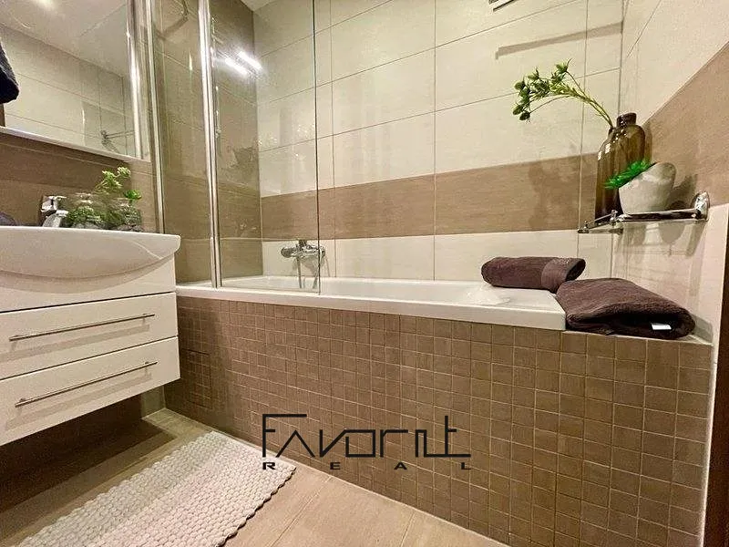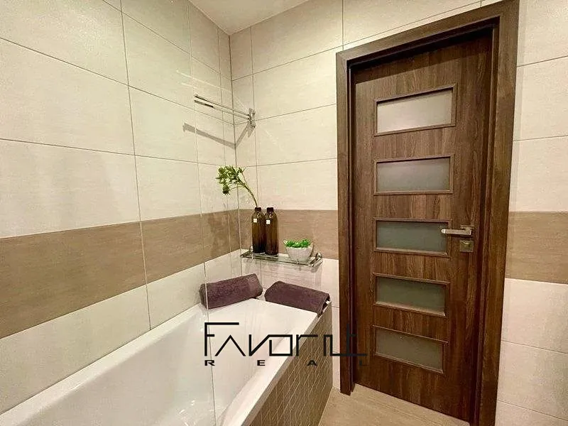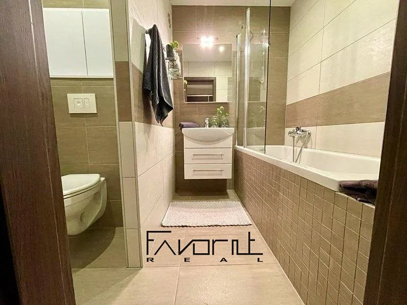 Nové obklady, dlažba, vana, umyvadlo se skříňkou, nové baterie a zrcadlová skříňka s úložným prostorem. Dále pračka v komoře.