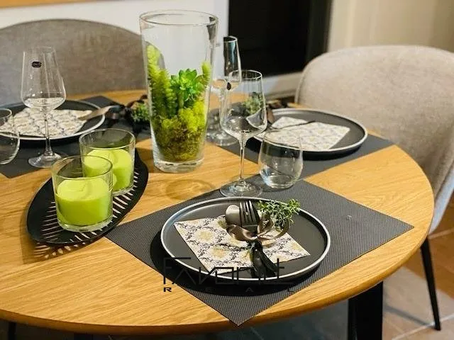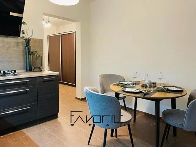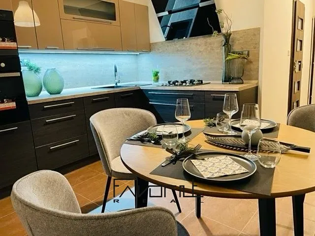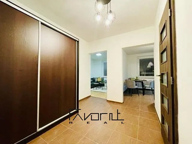 Byt je vybaven – jídelní stůl a židle, sedací souprava, konferenční stolky, koberec, osvětlení, vestavěná skříň v chodbě, zrcadlo.