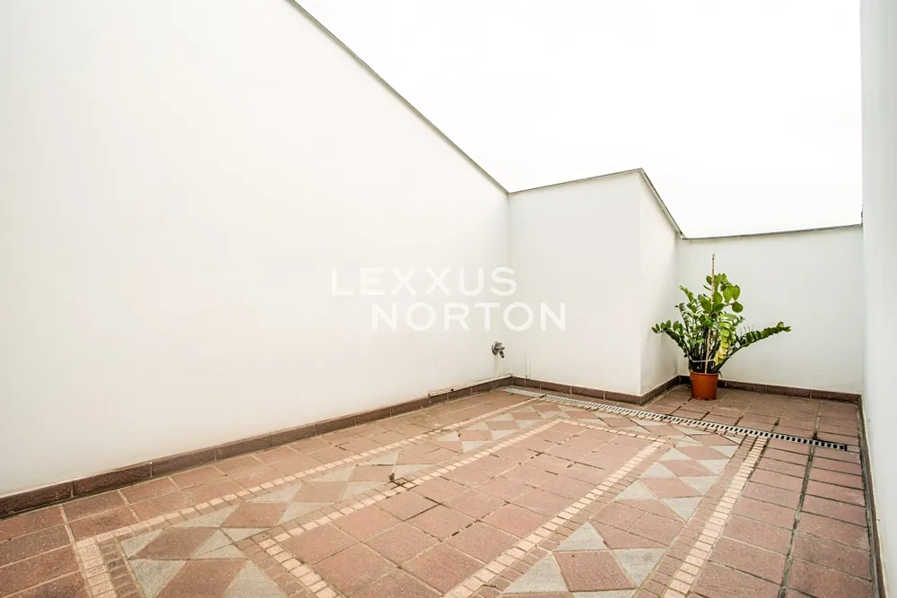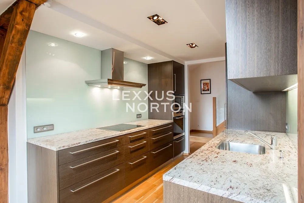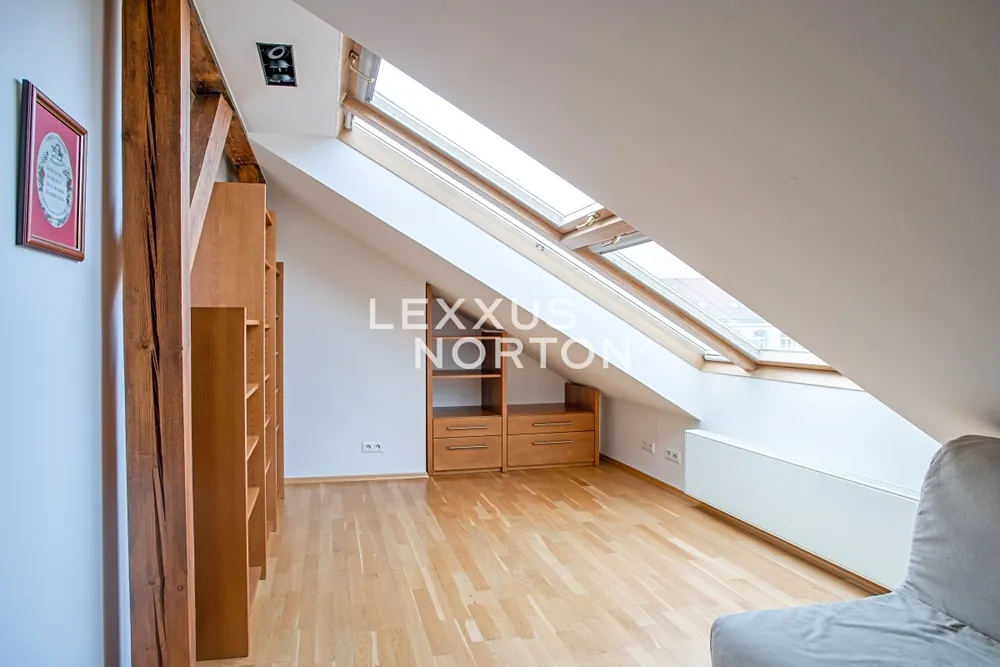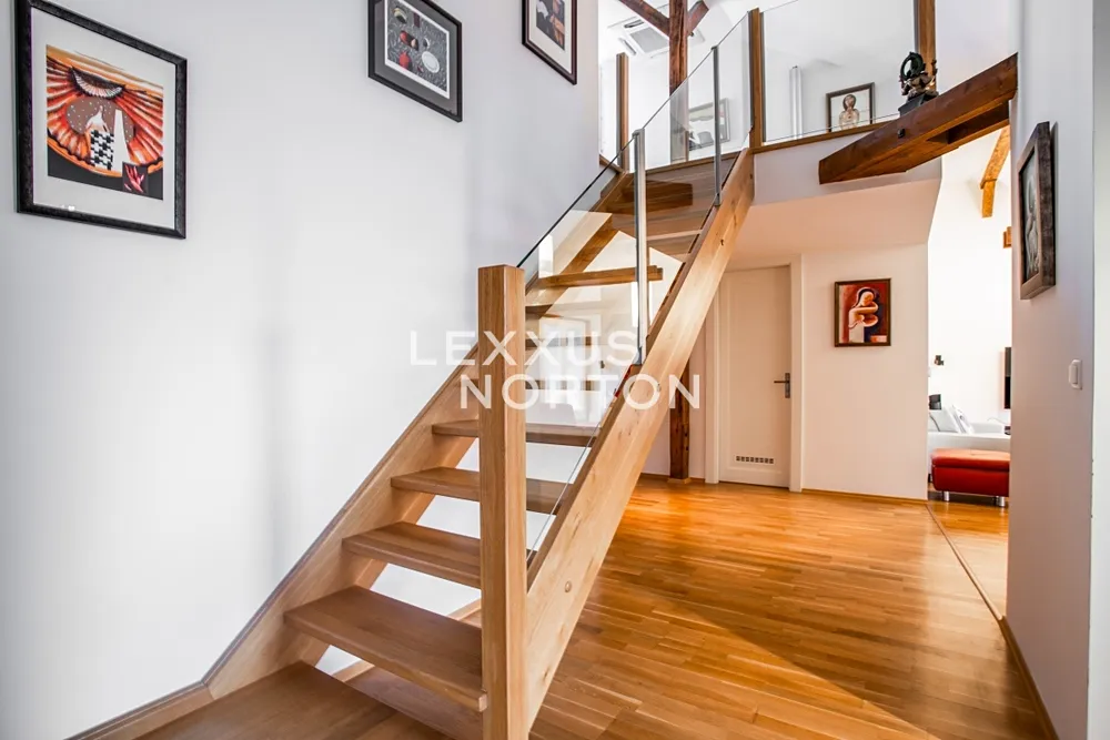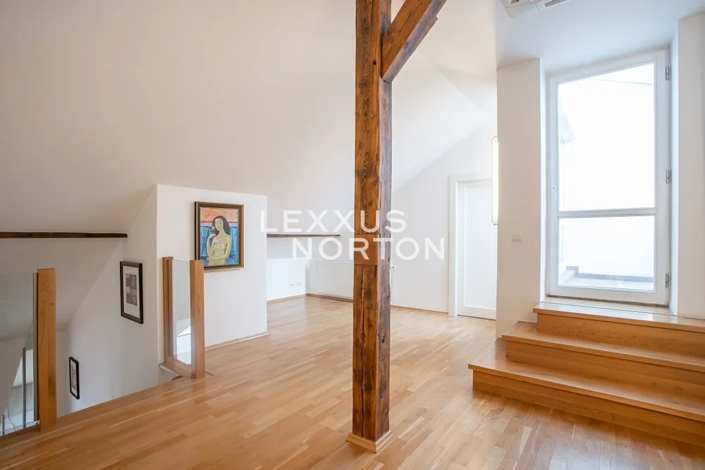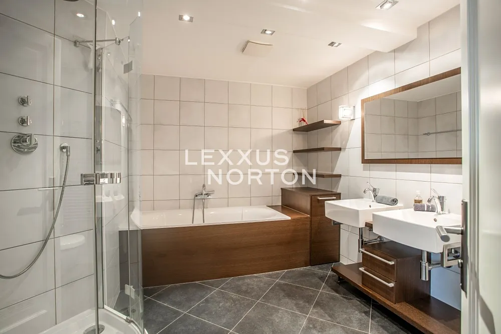 Tento exkluzivní, zařízený byt 5+kk k pronájmu nabízí k užívání vstupní chodbu, prostorný obývací pokoj s krbem, plně vybavený kuchyňský kout (sklokeramická deska, trouba, lednice, mrazák, mikrovlnná trouba a myčka nádobí) a jídelním prostorem. Dále se zde nachází 3 ložnice, 2 koupelny z toho jednu s vanou, pracovnu, galerii, zimní zahradu, samostatnou toaletu a 2 komory. K bytu náleží slunná terasa o velikosti 11 m2. K dispozici je sklep a parkovací stání v zakladači zahrnuto v ceně nájmu. Možnost pronájmu druhého parkovací stání a sklepa za extra měsíční poplatek. Rezidenční dům nabízí služby 24/7 recepce.