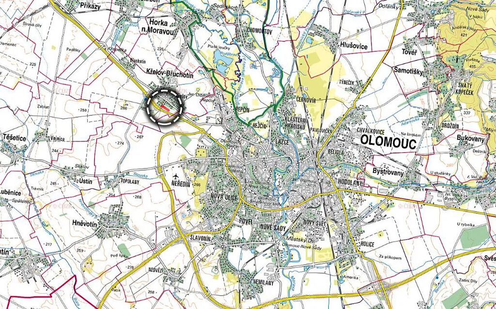 Konkrétně se jedná o parcelu 791/32 zapsanou na listu vlastnictví 1065 v katastrálním území Křelov. Výměra pozemku je 5 763 m2 a k prodeji je většinové vlastnictví 7/8, které zajišťuje možnost volného nakládání. Křelov-Břuchotín je obec v těsné blízkosti Olomouce (cca 5 km). Disponuje základní občanskou vybavenost včetně školy, školky a obchodů, a je dobře dostupná autobusovou dopravou i dálnicí D35.