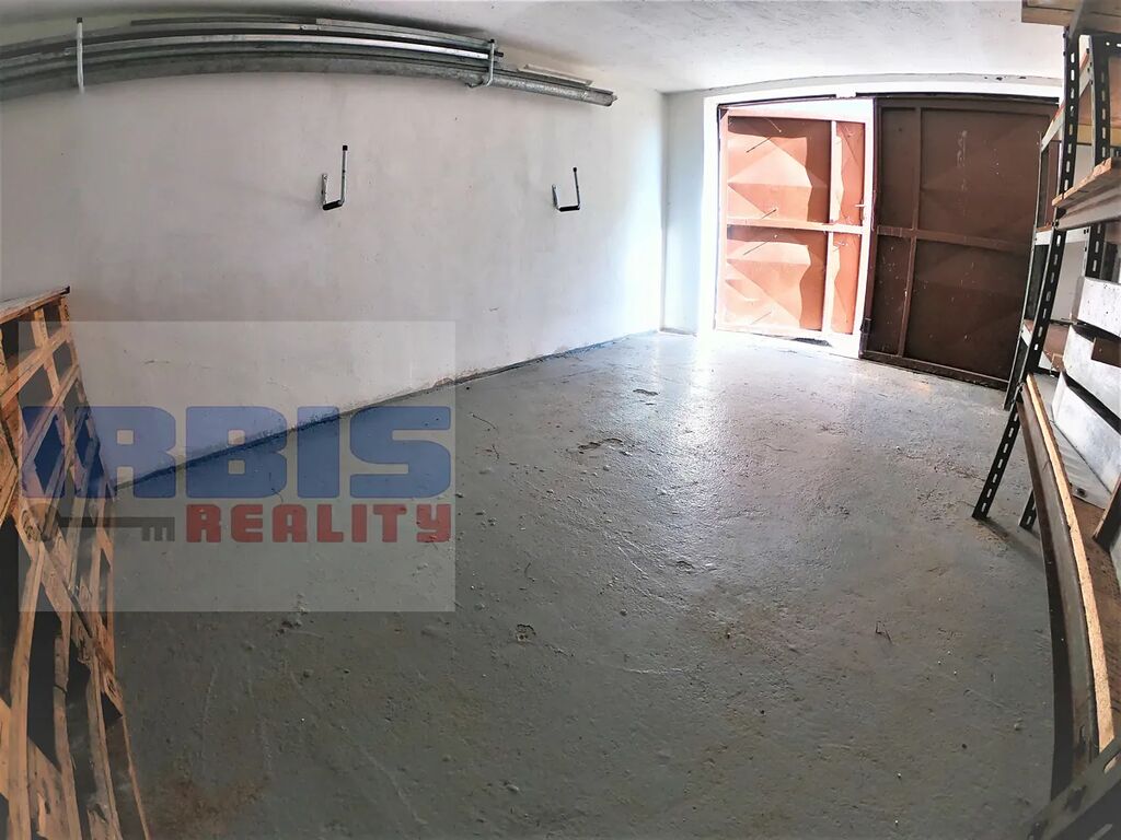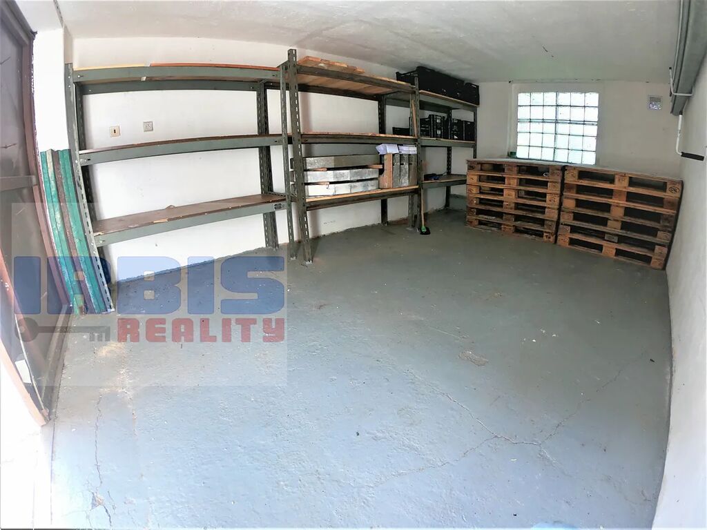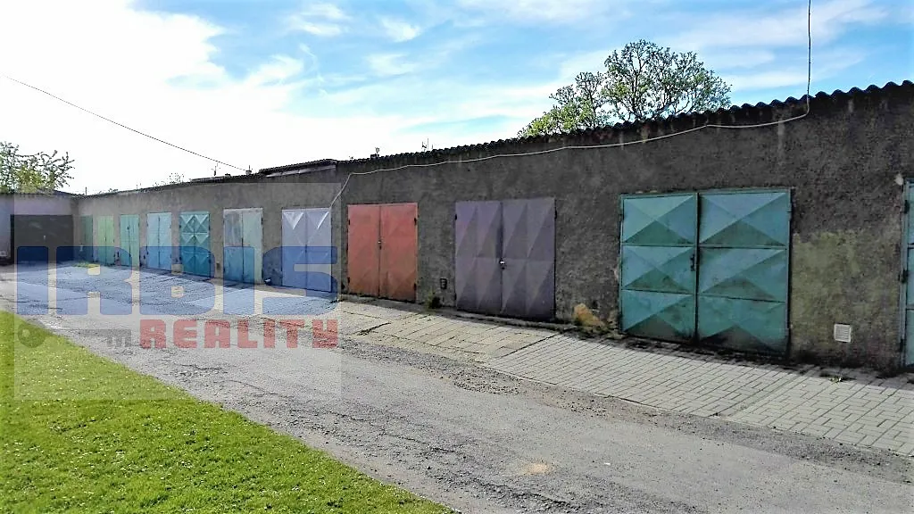 Garáž byla postavena roku 1973, má plochou střechu s krytinou z vlnitého eternitu, je cihlová a suchá – vhodné i na skladování zboží (odvětrání je zajištěno dvěma průduchy), betonová podlaha, s kovovými dvoudílnými vraty se zamykáním FAB, možno opatřit dalším přídavným zámkem. Dále je zde luxferové okno (zajišťující dostatek světla), které směruje na soukromý pozemek a na garáž je vidět z oken sousedních domů, což snižuje riziko vykradení.