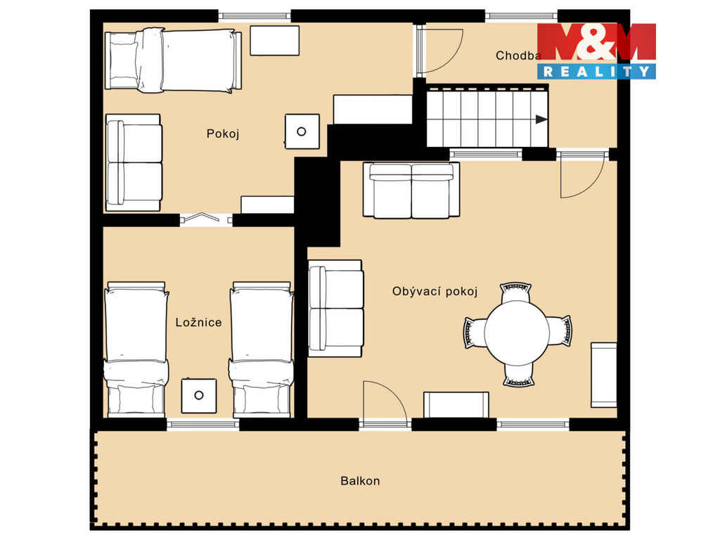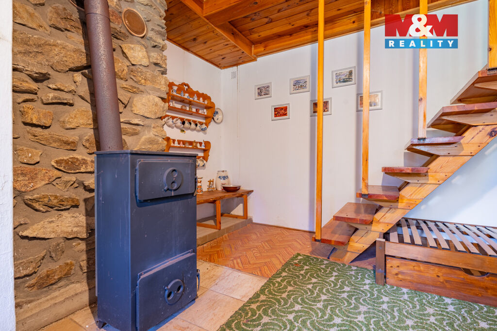 V přízemí chaty se nachází vstupní hala, koupelna, kuchyň a útulný obývací pokoj, z nějž vede dřevěné schodiště do patra s chodbou a třemi pokoji se vstupem na slunnou terasu. Chata je vytápěna kamny, prodává se včetně kompletního vybavení a je připravena k okamžitému užívání.