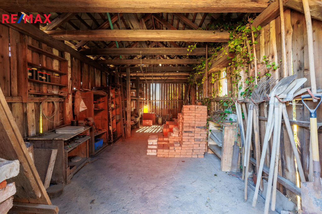 Stodola (81 m²) – otevřená až do hřebene střechy. Díky své výšce a velikosti nabízí unikátní potenciál pro přestavbu na moderní dvoupodlažní obytný prostor s otevřenou galerií, nebo na zázemí pro podnikání. Součástí stodoly je i garáž a podzemní sklep, který lze využít jako vinný sklípek či sklad potravin a surovin.