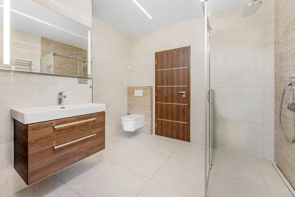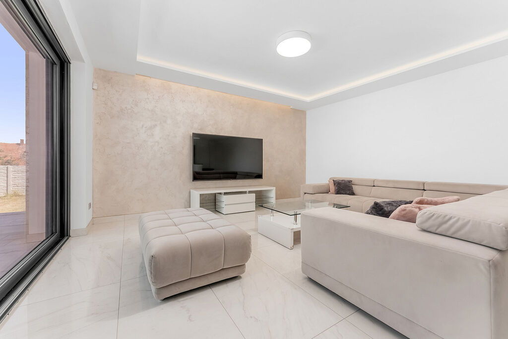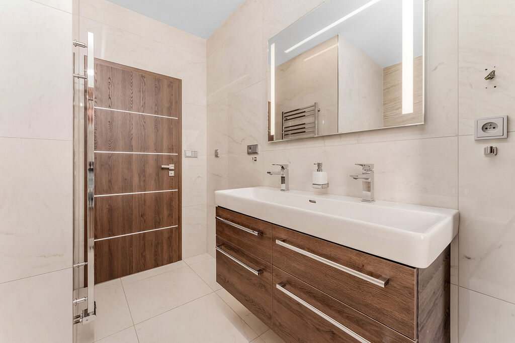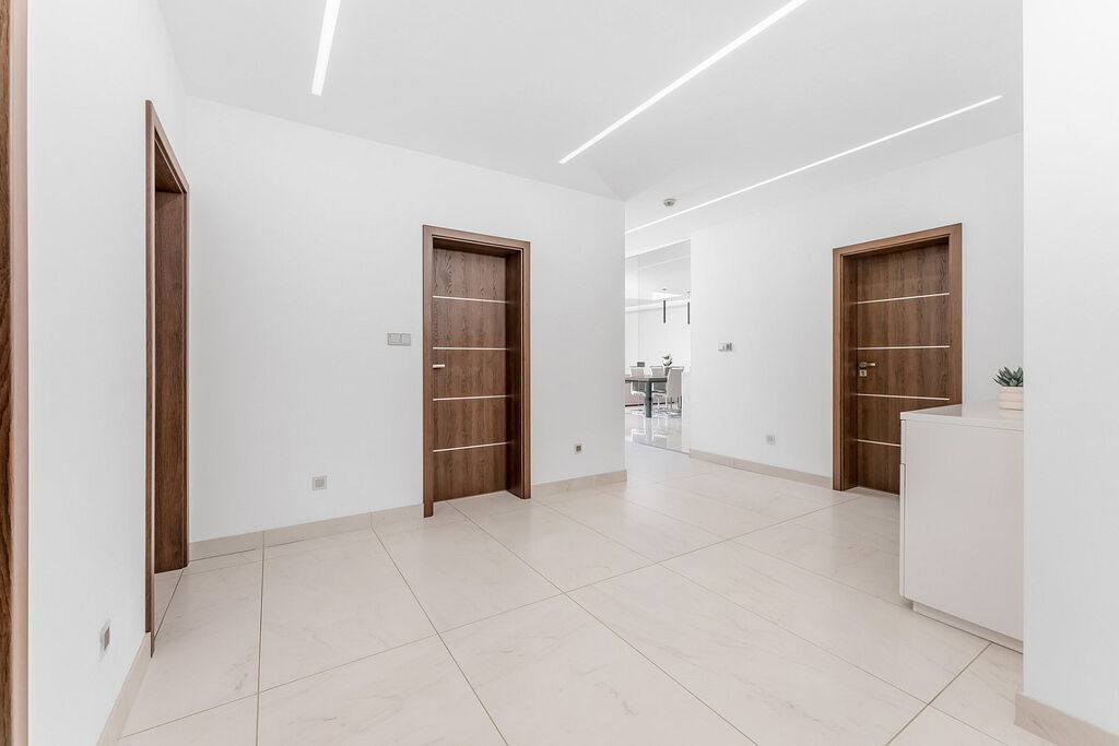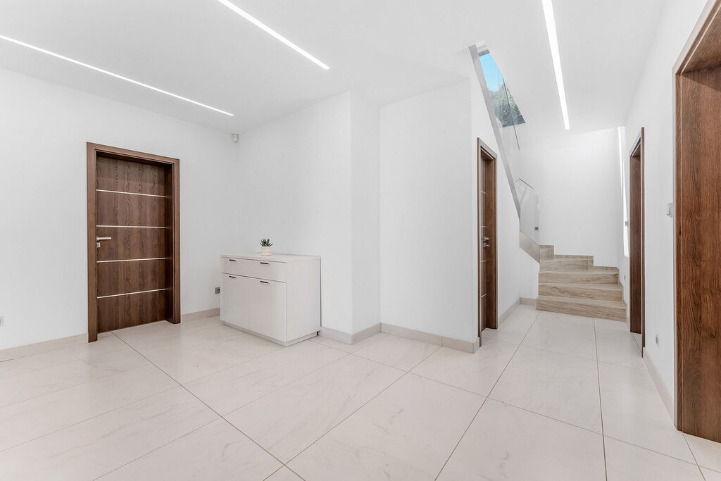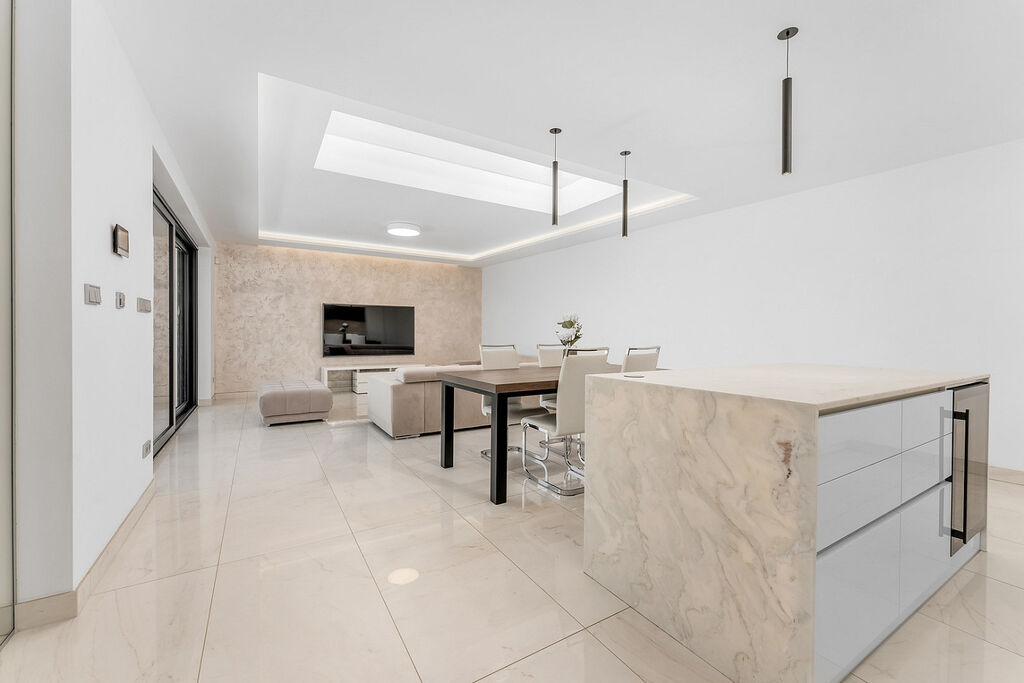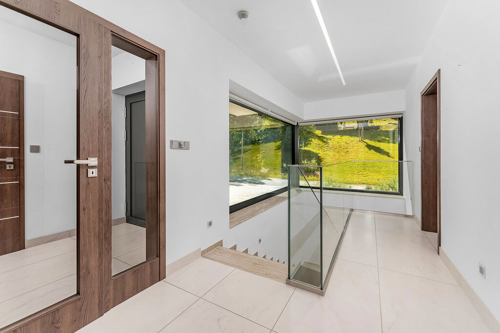 Srdcem domu je prostorná kuchyň propojená s jídelnou a obývacím prostorem. Moderní kuchyňská linka s ostrůvkem a tajnou spíží je navíc doplněna stylovým kvarcitovým pracovním povrchem. V celém domě dominují velkoformátové obklady. Skleněné komponenty, jako jsou zábradlí a prosklené stěny, propůjčují interiéru lehkost a vzdušnost. Dům byl navržen s ohledem na detail a praktičnost, což se odráží v minimálních provozních nákladech.