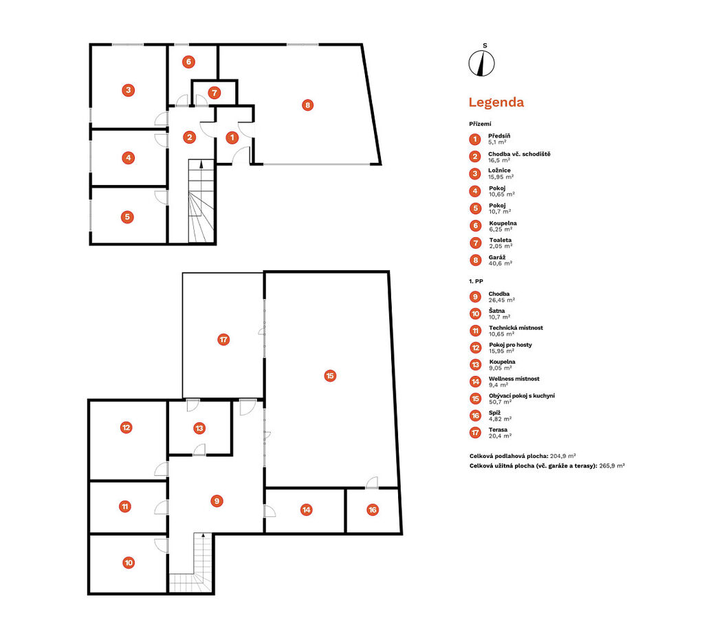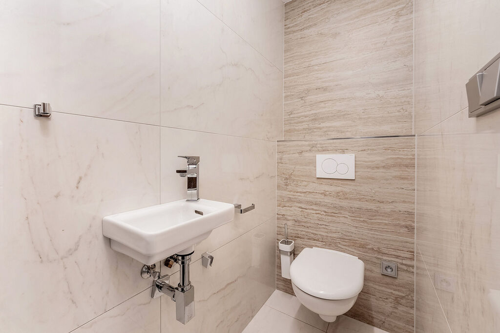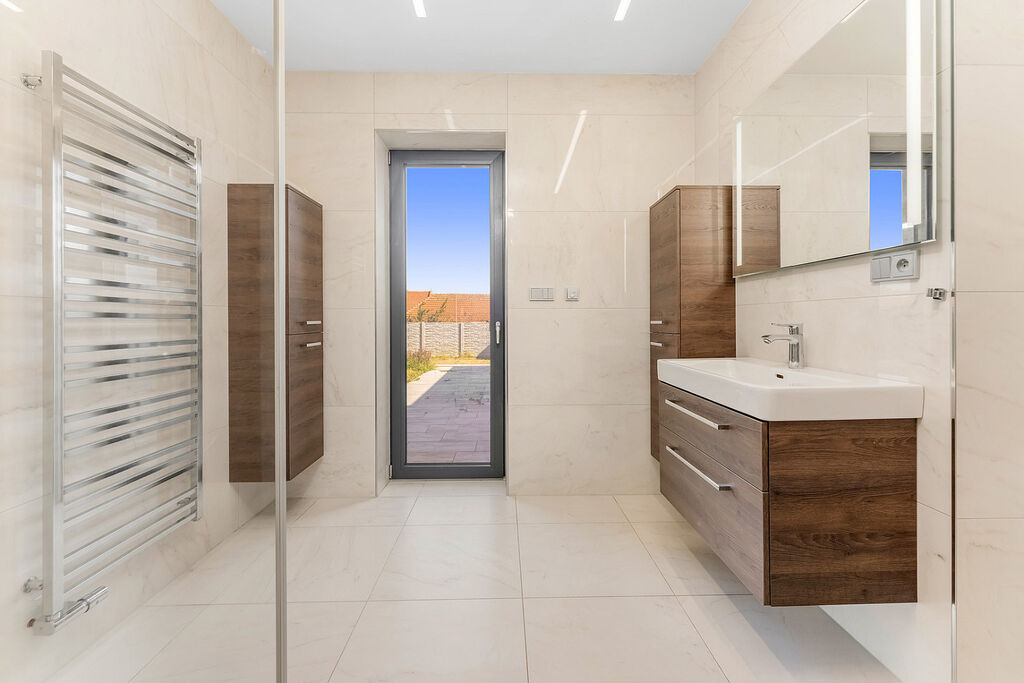 Novostavba o celkové užitné ploše 250 m² nabízí tři ložnice, pokoj pro hosty, jenž může být ideální dětskou hernou nebo pracovnou, a praktickou technickou místnost s kuchyńkou a s bočním přístupem do zahrady. Nechybí zde ani samostatná šatna a místnost připravená na budoucí privátní wellness. Všechny pokoje v 1. podzemním podlaží mají navíc přímý přístup do zahrady.