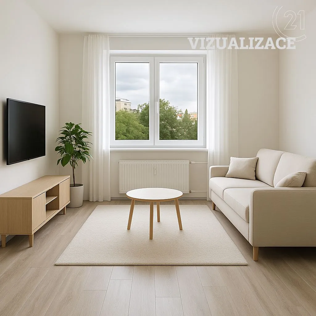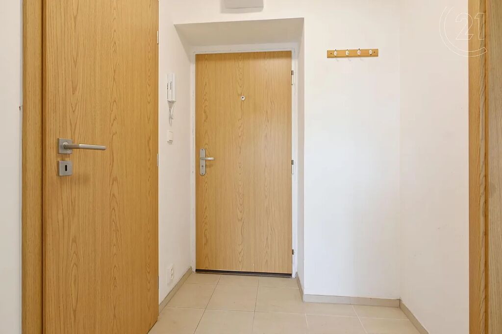 Jakmile vstoupíme dovnitř, máme po pravé straně koupelnu se sprchovým koutem, otopným žebříkem a WC. V kuchyni se nachází kuchyňská linka s elektrickou troubou, varnou deskou a digestoří. V samostatném pokoji a kuchyni je položena plovoucí podlaha, v chodbě a koupelně je dlažba. Pokoj je na fotografii i vizualizován pro lepší představu jak by mohl zařízený vypadat. V bytě jsou plastová okna.