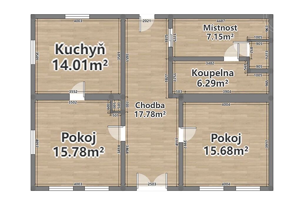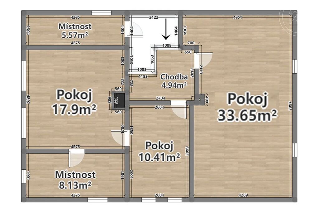 Dispozičně je nemovitost řešena jako 6+1, kdy v přízemí nalezneme prostornou chodbu, také je zde obývací pokoj ze kterého je vstup do kuchyně, další neprůchozí pokoj a také koupelna se sprchovým koutem a oddělená toaleta.