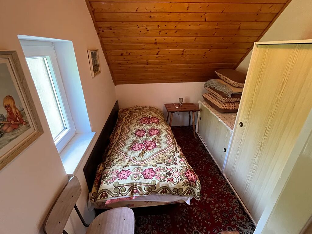 Dispozičně: V přízemí: vstupní zádveří, obývací pokoj s krbovými kachlovými kamny a se vstupem na krytou prostornou slunečnou terasu s průsvitnou střechou a výhledem do zahrady, neprůchozí pokoj - ložnice a samostatná kuchyně s dřevěným schodištěm do obytného podkroví, koupelna s WC + sprchový kout. V patře: 2 neprůchozí pokoje - velká ložnice s balkonem a koutem s umyvadlem + menší neprůchozí dětský pokoj či jako pracovna. Dále se sklopným žebříkem můžeme dostat na půdní úložné prostory. V přízemí je vstup do samostatné komory - sklepa pro uložení zahradní techniky, nářadí či uskladnění ovoce.