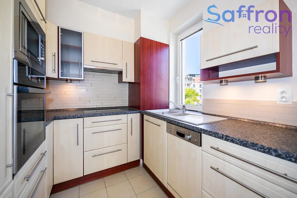 Obývací část plynule navazuje na kuchyň s barovým pultem a je plně vybavena spotřebiči (lednice s mrazákem, myčka, sklokeramická deska, trouba, digestoř a mikrovlnná trouba). Vstupní chodba nabízí vestavěné skříně na míru a koupelna je řešena s vanou, toaletou a pračkou.