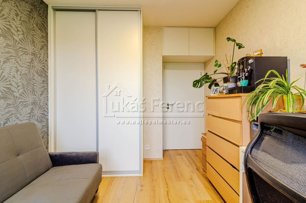 Součástí vybavení je kvalitní kuchyňská linka s kováním Blum a Hettich, na míru vyrobená TV stěna, vestavěné skříně a další úložné prvky. Benefitem jsou také žaluzie a sítě proti hmyzu, takže byt je připraven k pohodlnému bydlení bez dalších investic.