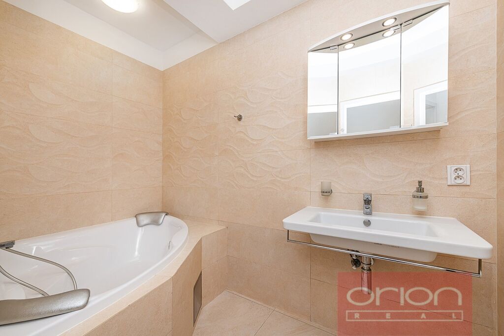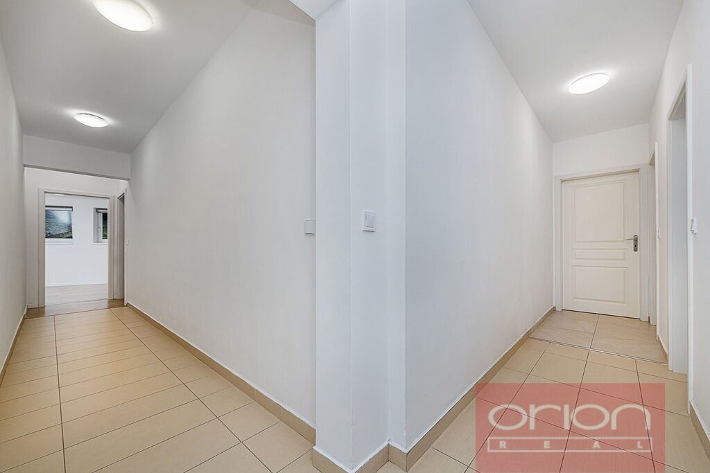 Dispozice bytu nabízí zádveří, prostornou chodbu s vestavěnými skříněmi, samostatnou kuchyň s moderní kuchyňskou linkou s pracovní deskou Dekton a všemi kuchyňskými spotřebiči, 5 samostatných pokojů, 1 koupelnu se sprchovým koutem a toaletou, 1 koupelnu s vanou, 2 samostatné toalety a technickou místnost s vestavěným policovým systémem, pračkou a sušičkou. Ve dvou ložnicích jsou vestavěné skříně a nábytek, podlahy jsou kvalitní vinylové. Vytápění je zajištěno plynovou kotelnou v domě.