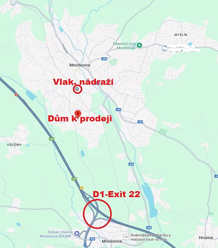 Vlakové nádraží v Mnichovicích je 10 min. chůze od domu. Napojení na D1 (exit 22) pak zabere pouze pár minut autem (4 km). Ač v blízkosti dálnice D1, tak je garantováno ticho a klid, a to díky kopci, který dálnice od domu odděluje.