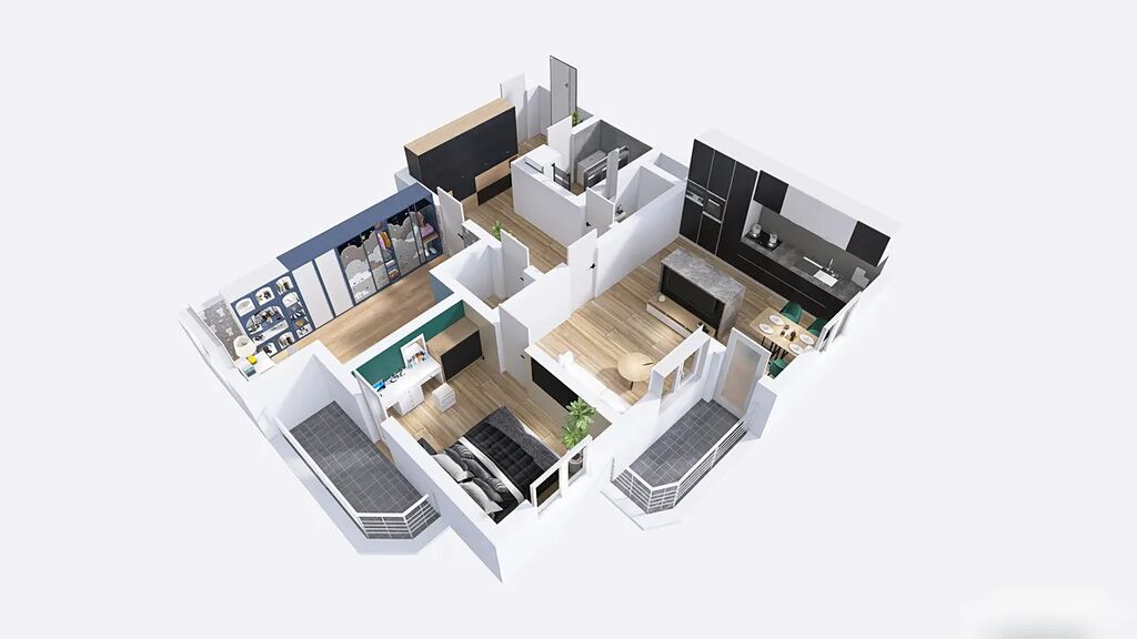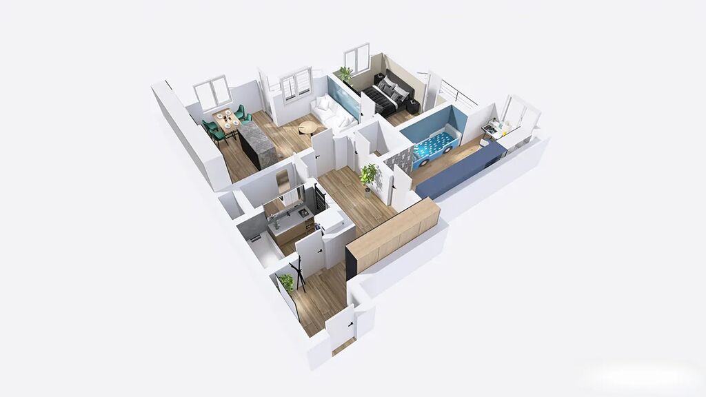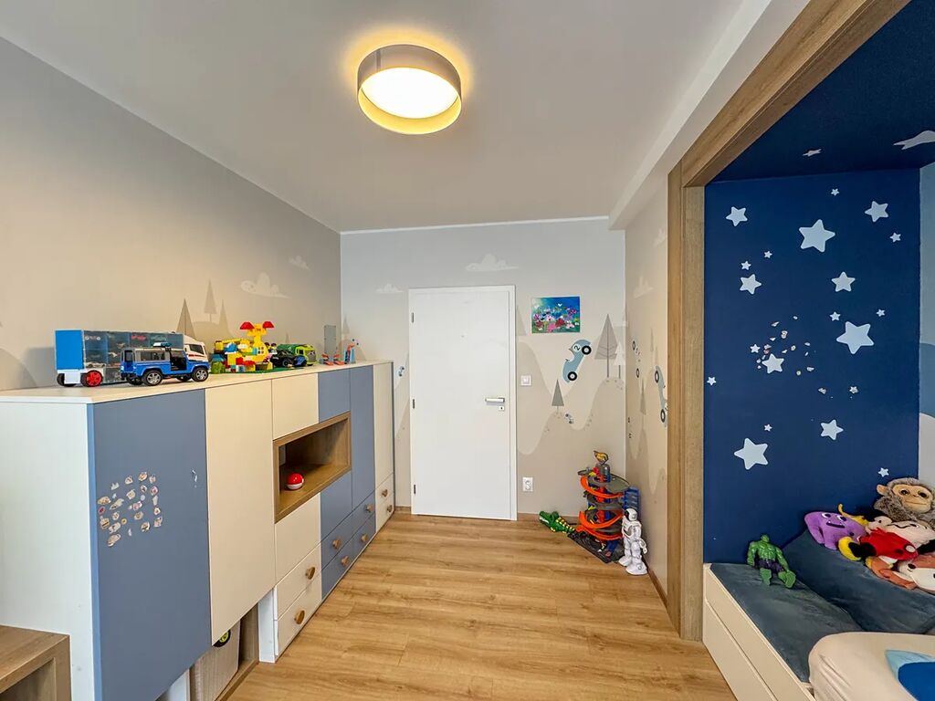 Dispozice bytu je velmi praktická a promyšlená: z předsíně se vstupuje samostatně do dětského pokoje, koupelny, na toaletu, do komory a do obývacího pokoje s kuchyňským koutem. Z obývací části je pak vstup do ložnice. Byt nabízí dostatek světla, úložných prostor a pohodlí pro rodinu, pár i jednotlivce.