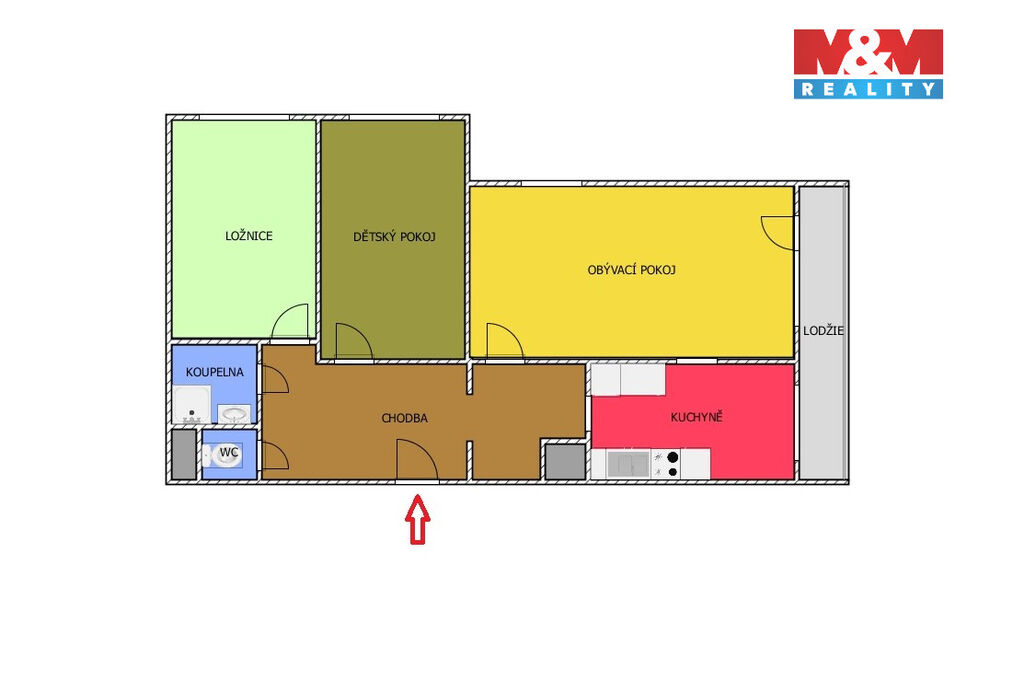 Dispozice: samostatná kuchyně s kuchyňskou linkou a vestavnými spotřebiči, obývací pokoj, ložnice, pokoj, koupelna se sprchovým koutem, samostatné WC. K bytu náleží také sklepní kóje a možnost užívání společné kolárny a sušárny.