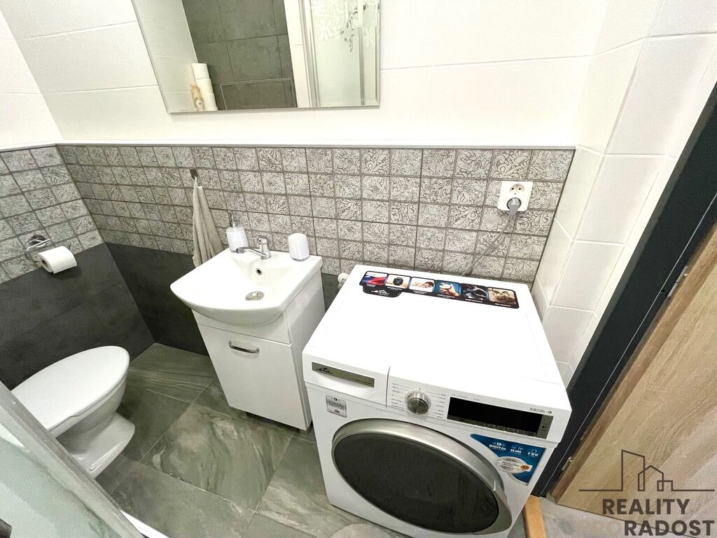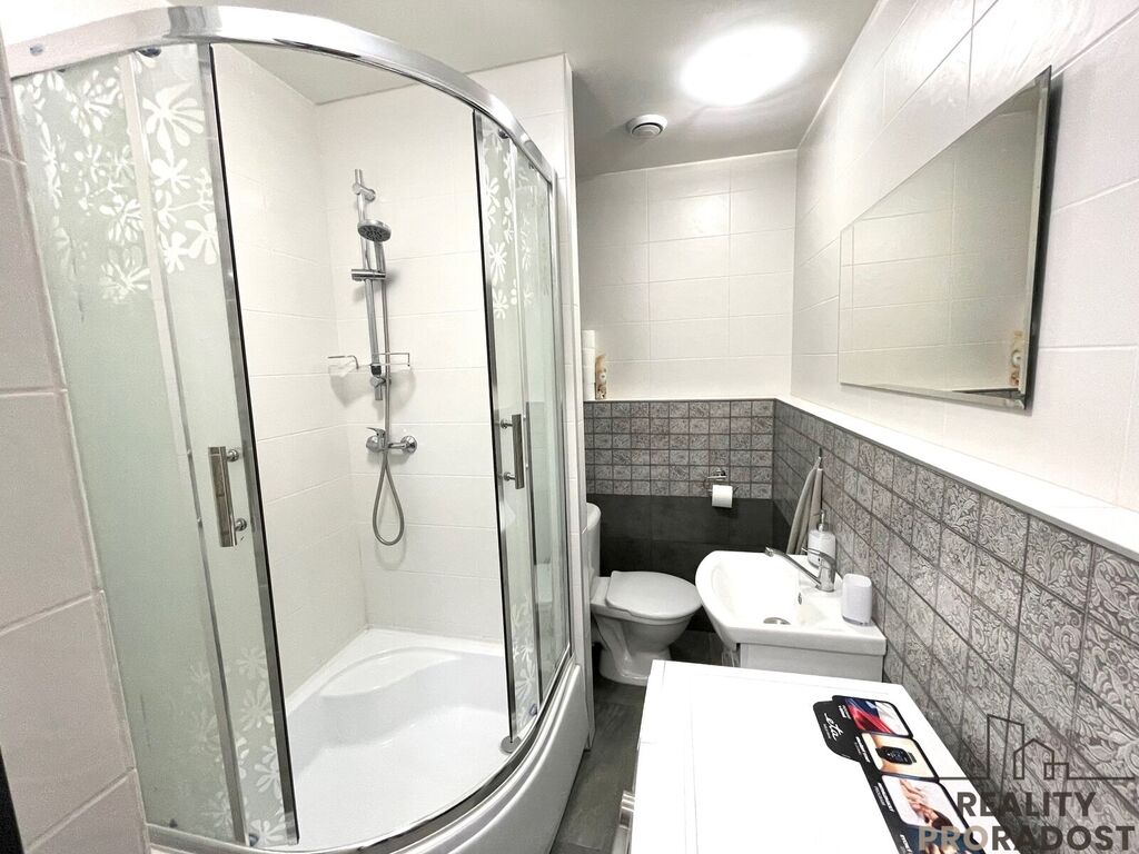 V koupelně je velký sprchový kout, pračku je možné umístit i do kuchyně, v kuchyni je nová kuchyňská linka s indukční sklokeramickou deskou a elektrickou troubou a s digestoří. Možnost umístit myčku.