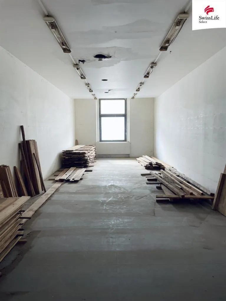 V patře, které je přístupné po širokém schodišti, jsou tři samostatné velké místnosti po cca 45 m, z každé strany ještě menší (21m a 23 m). Najdete tu širokou středovou chodbu (104 m) a původní sociální zázemí. Na podlaze je lino v docela dobrém stavu. Výtah byl zrušený a do patra je přístup pouze po schodech. Jinak je vše připraveno k dokončení podle potřeb a představ nového majitele. Investice ale není vysoká, patro se upozadilo kvůli investicím do přízemí a do celkového technického stavu budovy.