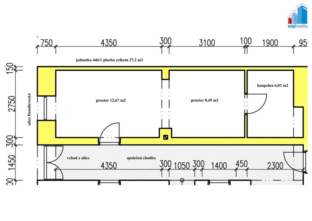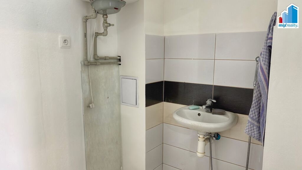 První prostor má výměru cca 27,2 m², vstupuje se do něj ze společné chodby a je vybaven kuchyňskou linkou s vestavěným sporákem, bojlerem, sprchovým koutem, toaletou a přípravou na pračku.