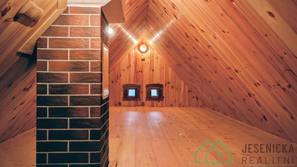 V jednom pokoji vstup do půdního prostoru, který je rovněž obložen jasanem a může sloužit jako další místo k přenocování.