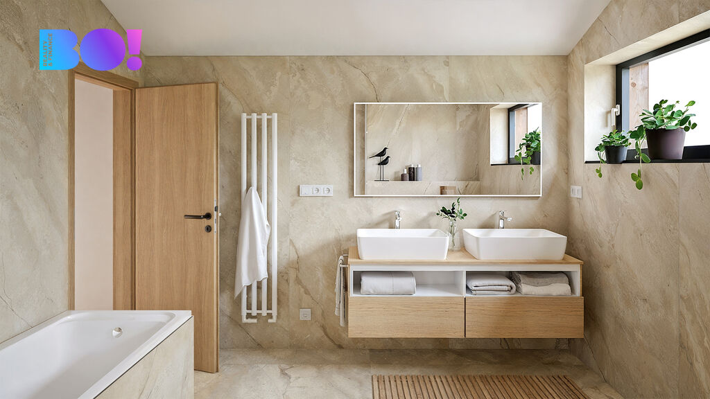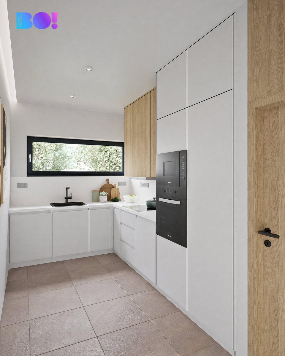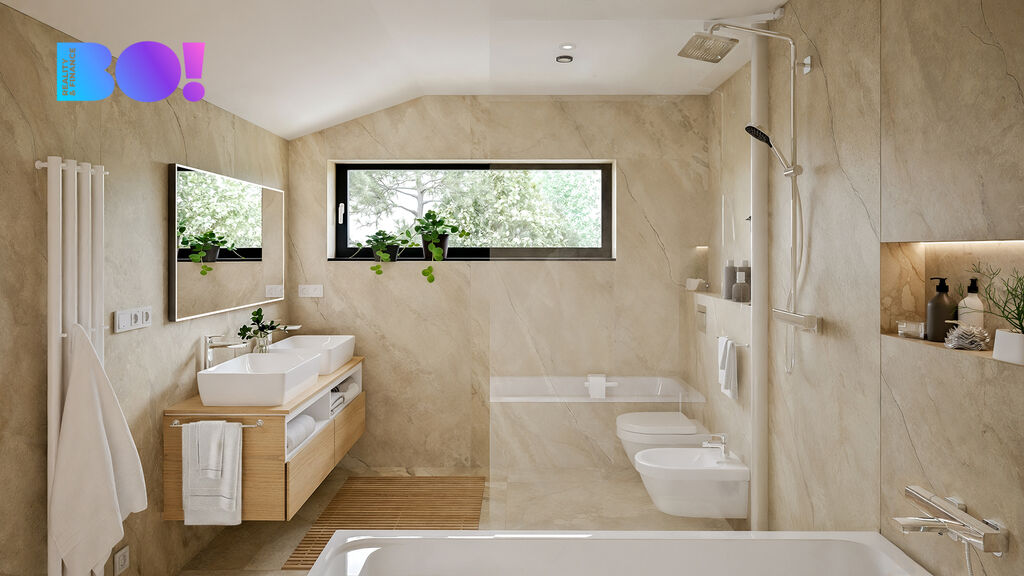 Interiér je navržen v duchu přírodních materiálů a kvalitního zpracování – světlé dřevěné podlahy, velkoformátová dlažba, koupelny od studia Elements, sanita Villeroy & Boch a moderní kuchyně Miele se všemi vestavěnými spotřebiči.