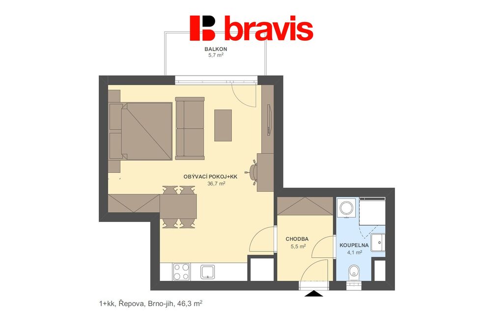 Pronájem bytu 1+kk, Brno - Horní Heršpice, Řepova, 46 m2