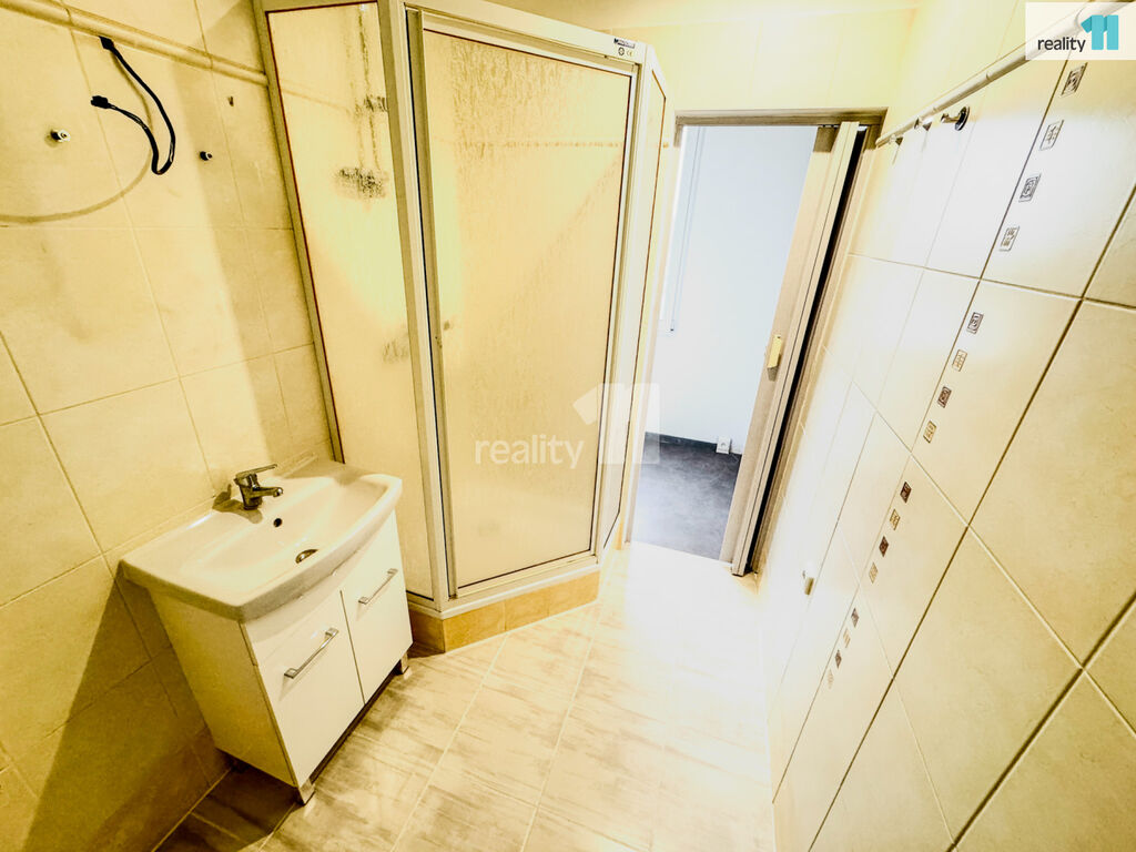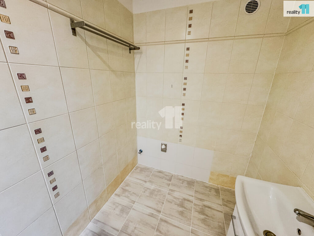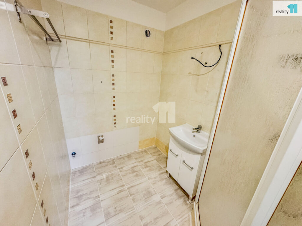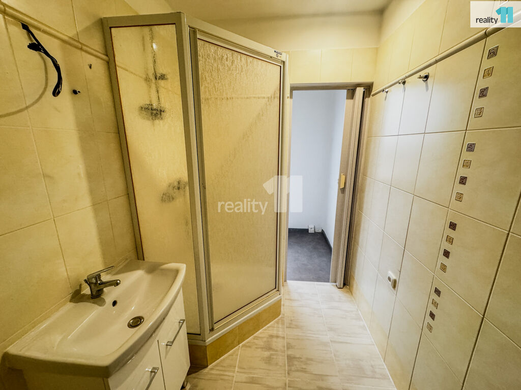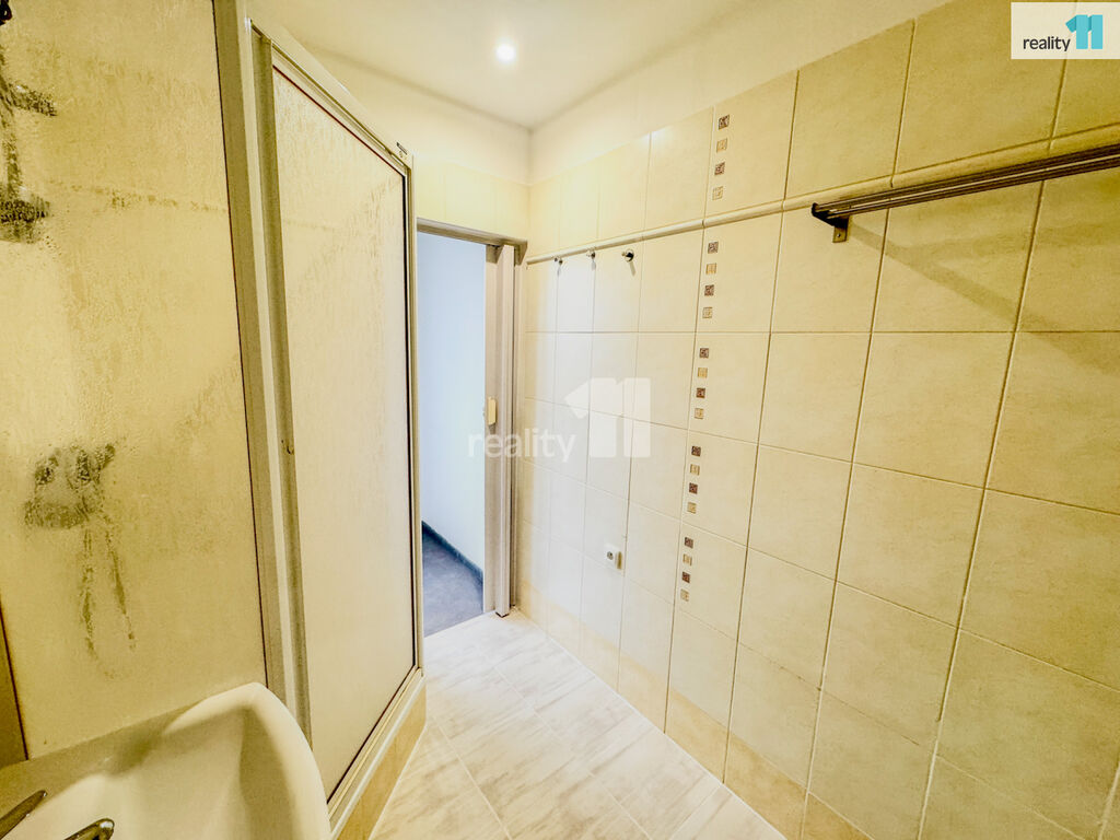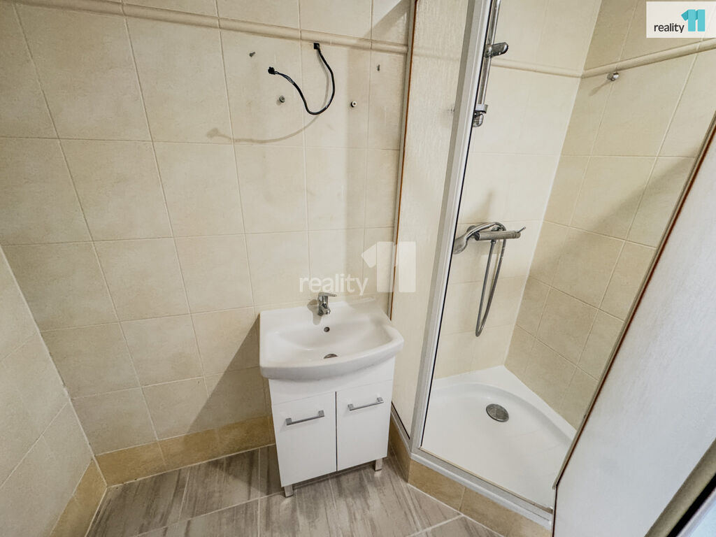 Koupelna se sprchovým koutem, umyvadlem, přípojkou na pračku a prostorem na sušičku.