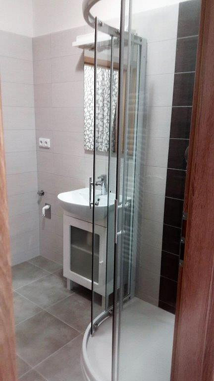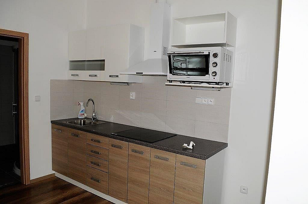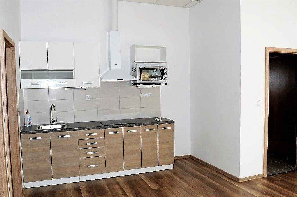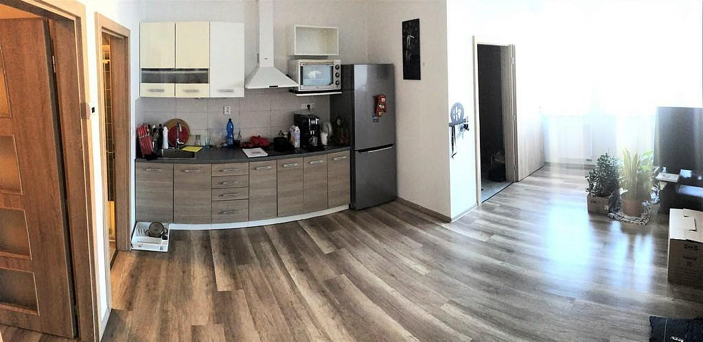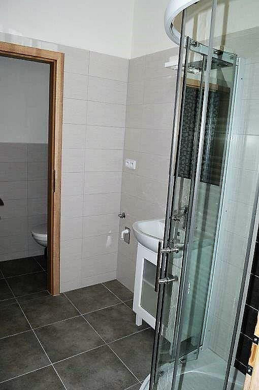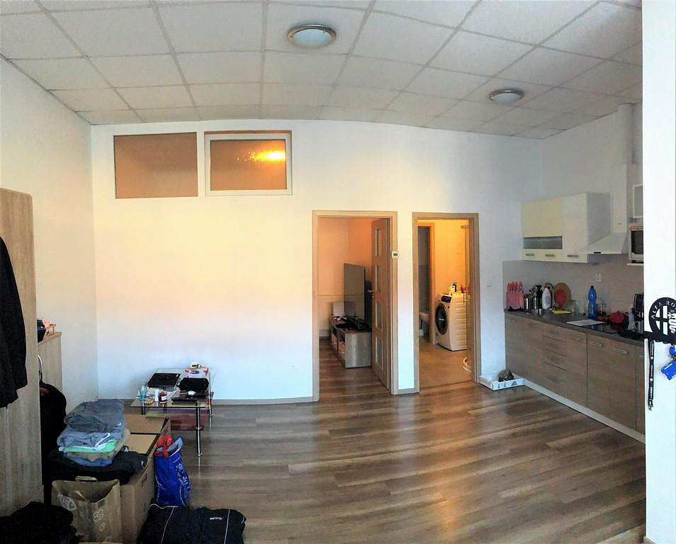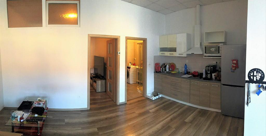 Dále je vstup do prostorného obývacího pokoje spojeného s kuchyňským koutem. Je tu nová kuchyňská linka s indukční varnou deskou, troubou a digestoří. Z této místnosti vcházíme do pokoje, který může sloužit např. jako ložnice, a dále do koupelny s novým sprchovým koutem a umyvadlem. Za koupelnou se nachází samostatné WC.