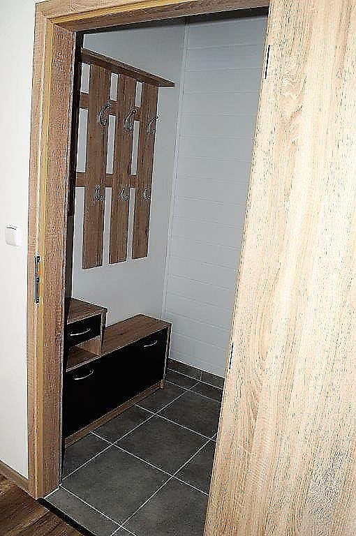 Za vchodovými dveřmi se nacházíme ve vstupní předsíni, kde nalezneme botník a věšáky na oblečení.