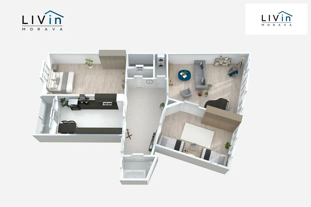 Byt je dispozičně řešen tak, aby nabídl dostatek prostoru pro pohodlné bydlení. Tvoří jej prostorná předsíň (19,03 m²), kuchyně (18,42 m²), tři pokoje (26,80 m², 22,92 m² a 35,23 m²) - všechny s vlastním vstupem z předsíně, koupelna (5,12 m²), samostatné WC (1,62 m²) a spíž s přípojkou na pračku a sušičku (2,22 m²). K bytu dále náleží lodžie (4,50 m²) a sklepní prostor (17,24 m²) v 1. podzemním podlaží.