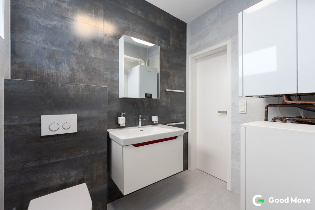 Koupelna o rozloze 6 m² je vybavena moderním, prostorným sprchovým koutem, toaletou se samostatnou bidetovou sprškou, umyvadlem, koupelnovou skříňkou a kvalitními sanitárními prvky značky Laufen. Baterie jsou od renomované značky Tres. O vytápění se stará nový plynový kondenzační kotel Vaillant (instalace 2023), který zajišťuje úsporný a komfortní provoz.