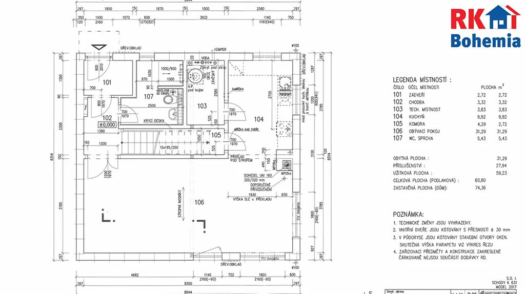 -přízemí: zádveří-3m2, chodba-3.3m2, koupelna+WC-5.5m2,tech.místnost-4m2,komora-4.2m2,kuchyň-10m2,obývací pokoj-31m2. Celková užitná plocha přízemí je 61m2.
