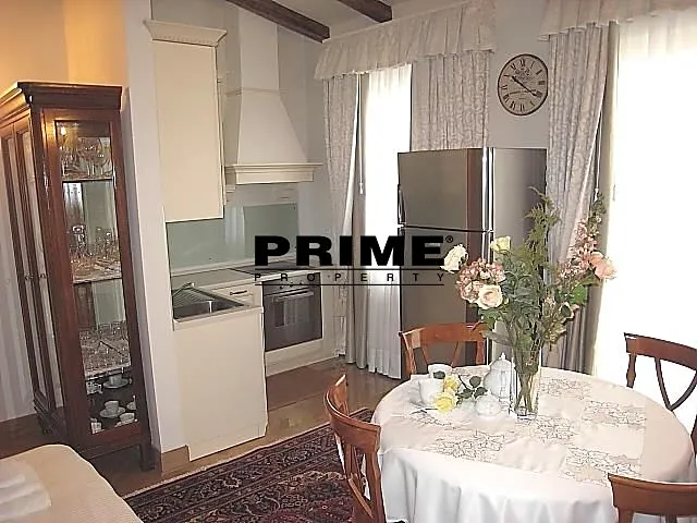 Byt je zařízen kvalitním italským nábytkem. Dispozice bytu: vstupní předsíň, jedna obytná místnost zahrnující obývací část, část na spaní a jídelní část s plně vybaveným kuchyňským koutem se spotřebiči (sporák, lednice s mrazákem a myčka), koupelna (s vanou, umyvadlem, toaletou a bidetem) a balkon orientovaný do zahrady ve vnitrobloku.