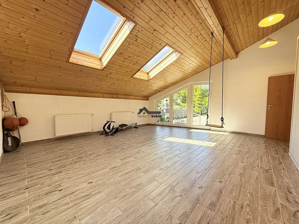 • Přízemí: prostorný obývací pokoj s krbem a plně integrovaným systémem domácího kina s rozvody pro prostorový zvuk, kuchyň s jídelnou a spíží, dvě ložnice, koupelna, samostatné WC, technická místnost s FVE a tepelným čerpadlem, garáž s centrálním vysavačem, infra sauna a prostorná místnost, kterou si můžete přizpůsobit podle svých potřeb – ať už toužíte po domácí posilovně, relaxační zóně se zelení nebo místě pro rodinnou zábavu.