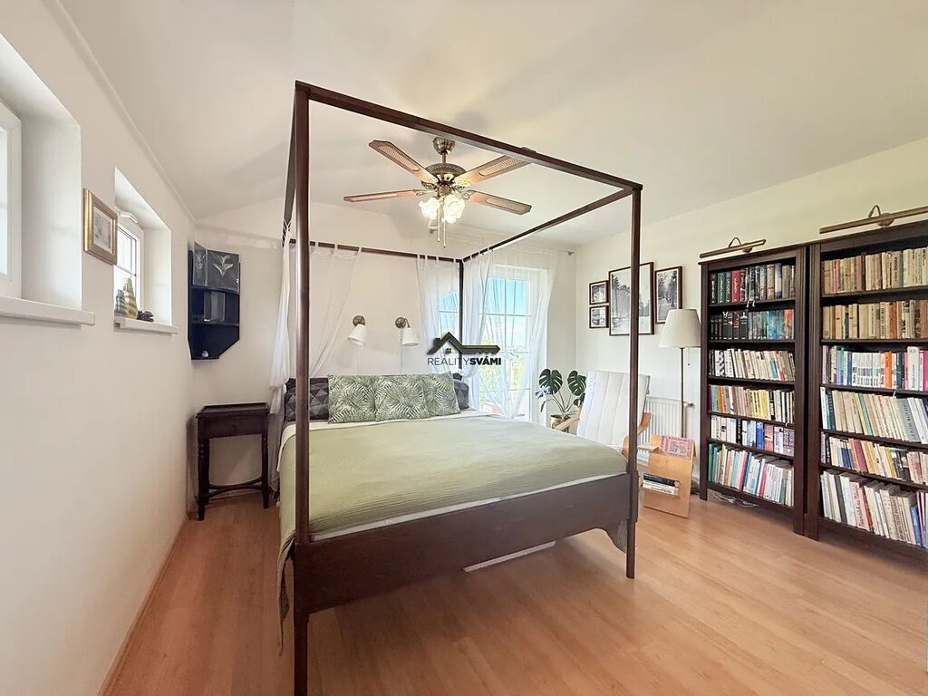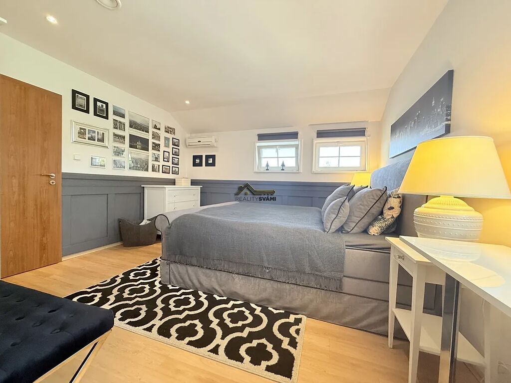 • Patro: hlavní ložnice s vlastní šatnou, moderní koupelna s vestavěným ozvučením, dvě další ložnice se společným balkonem a prostorná galerie s posezením.