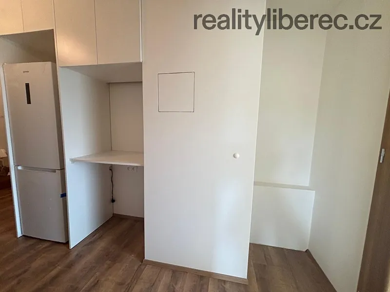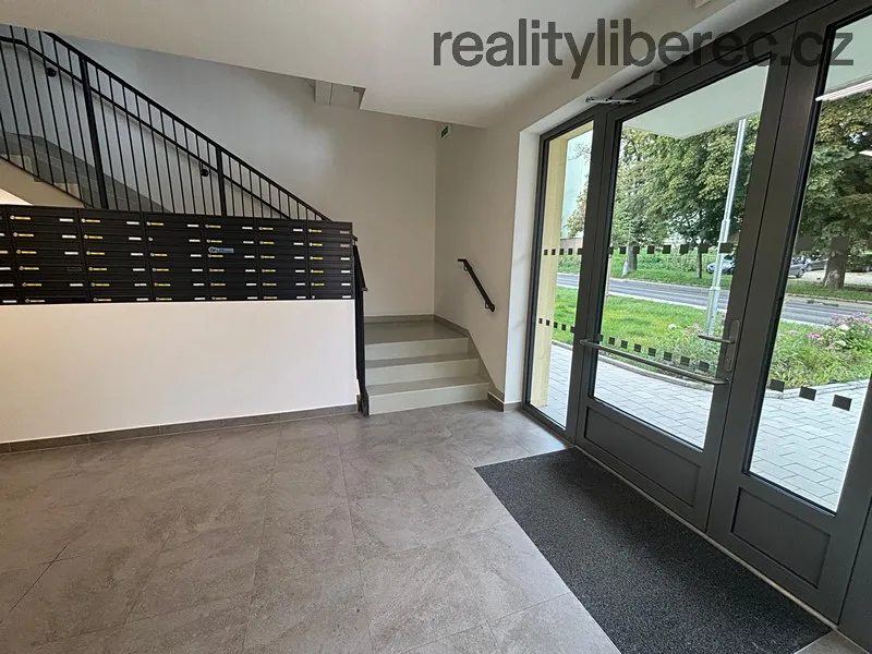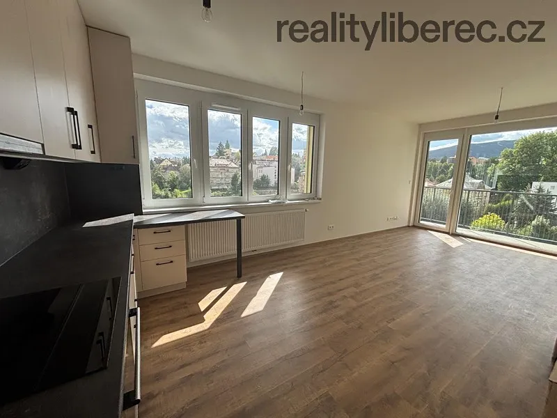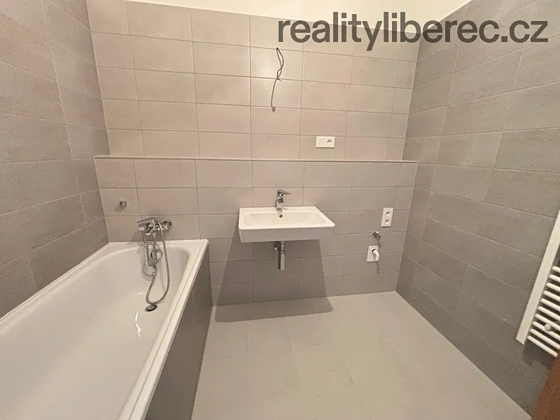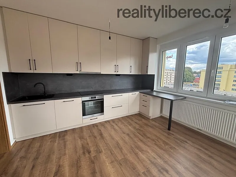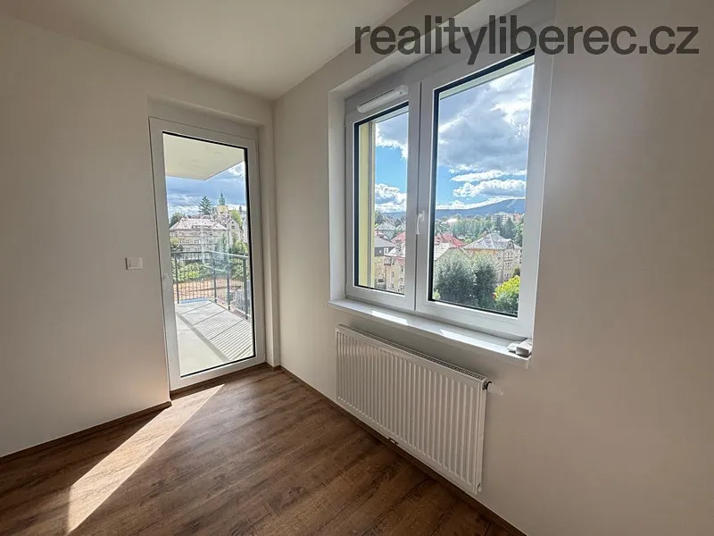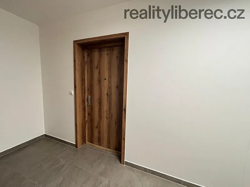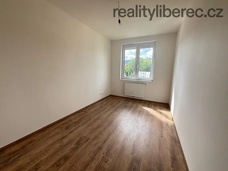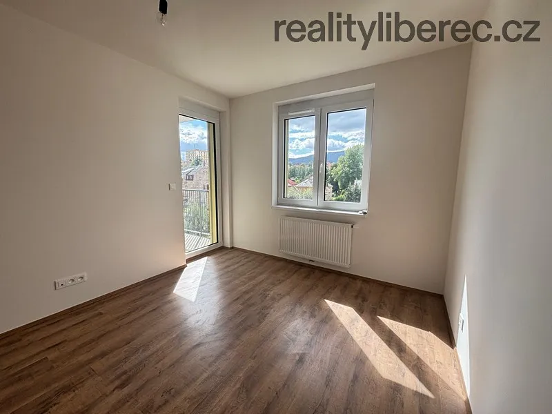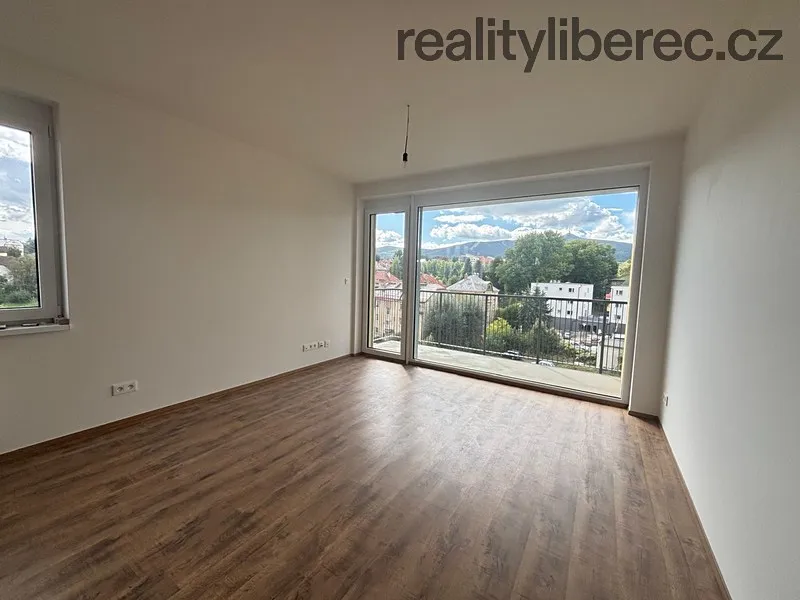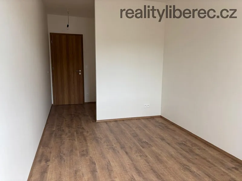 Byt je nový v 5.NP, připraven pro prvního nájemníka. Skládá se z prostorného obývacího pokoje s kuchyňským koutem, vstupem na balkon s nádherným výhledem na Ještěd, dále ze 2 pokojů (z nichž jeden má také přístup na balkon), koupelny s vanou, samostatného WC a chodby. Okno v obývacím pokoji je velkoformátové vybavené venkovní elektrickou žaluzií na dálkové ovládání. V obytných místnostech je plovoucí - vinylová podlaha, v koupelně a WC dlažba.