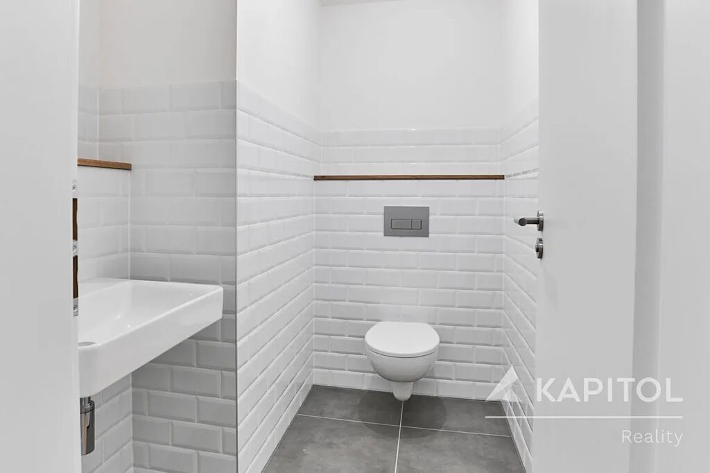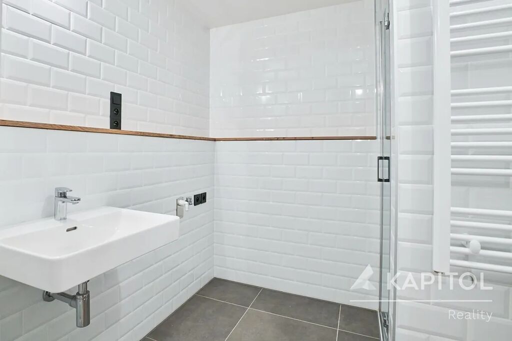 •Koupelna ve spodní části bytu: 4,66 m², vybavena sprchovým koutem, umyvadlem, WC a prostorem pro pračku