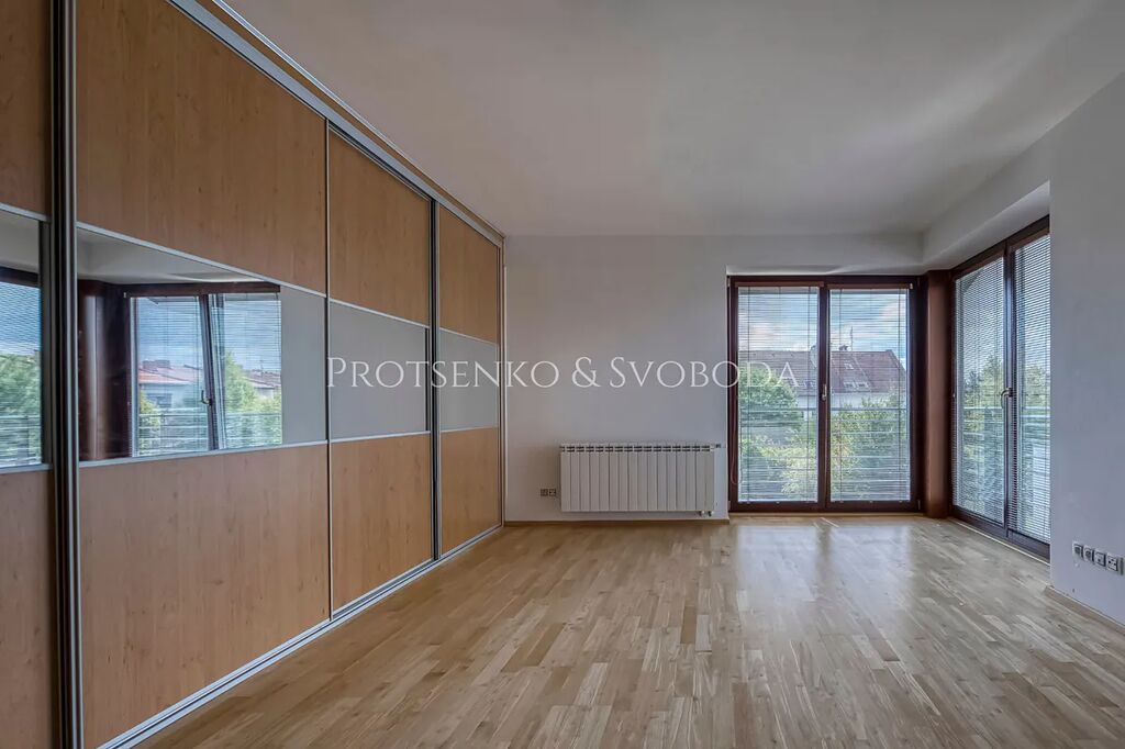 Tři prostorné pokoje (ve dvou jsou vestavěné skříně), samostatná šatna/pracovna a velká koupelna s rohovou vanou, sprchovým koutem, dvěma umyvadly, WC a bidetem. Podlahy jsou plovoucí dřevěné, vytápění je zajištěno hliníkovými radiátory. Z chodby je vstup na střešní terasu (65 m²), která navazuje na balkon (21 m²) orientovaný na jih.