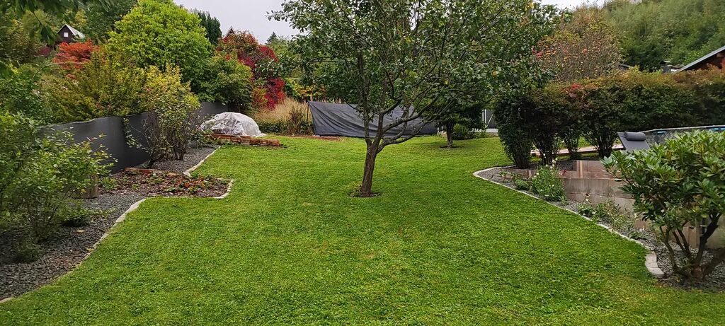 Zahrada je velmi vkusně osázena okrasnými keři, stromy a květinami.